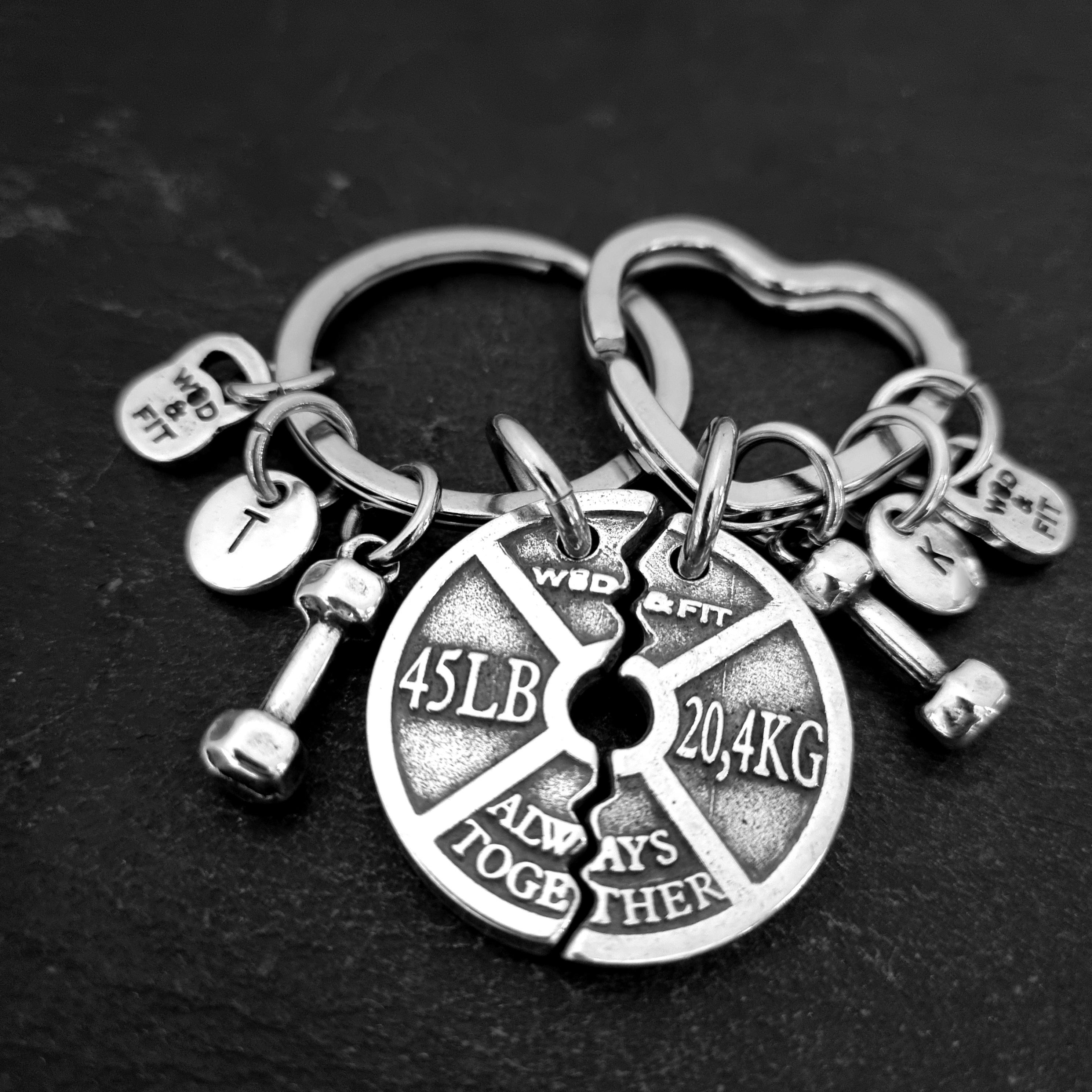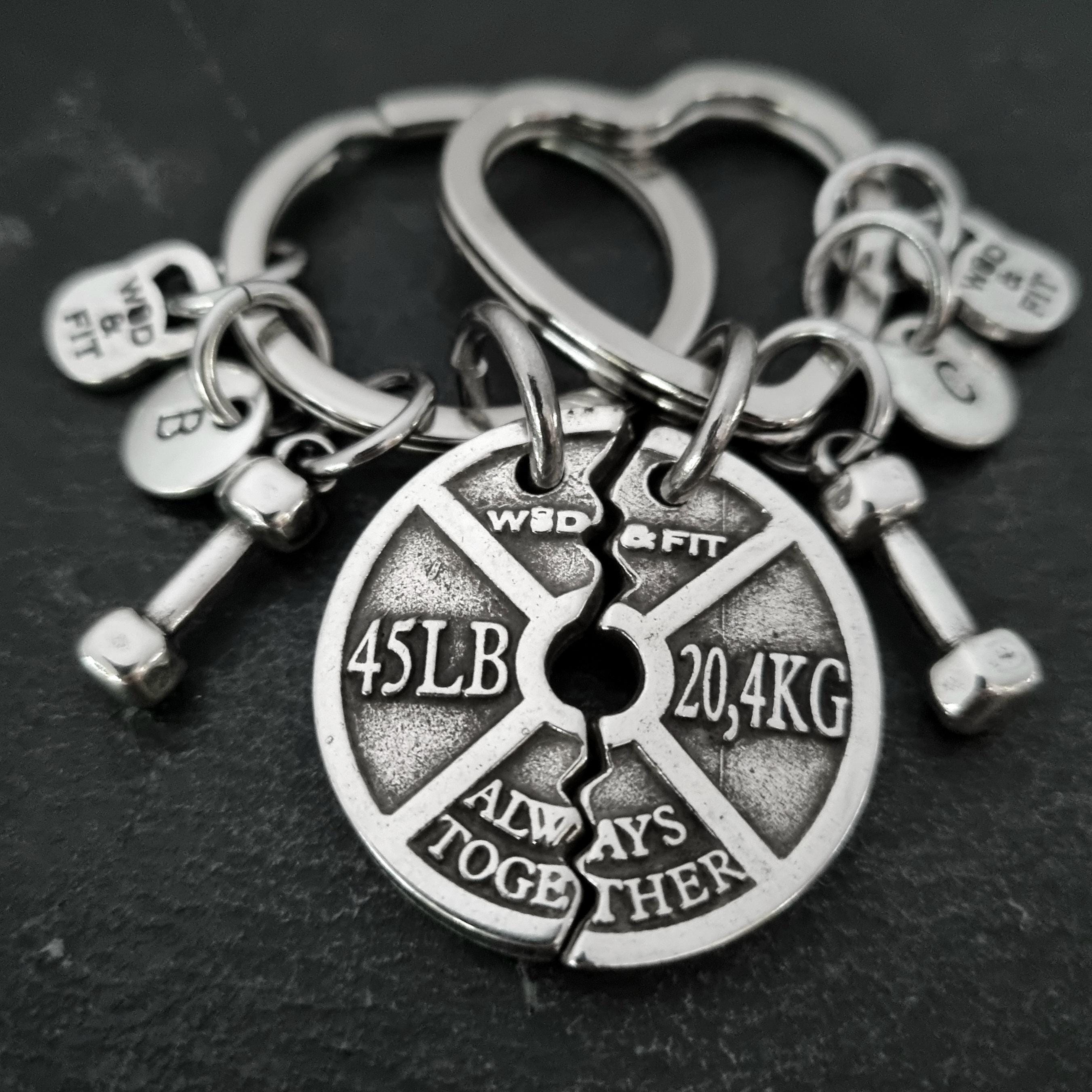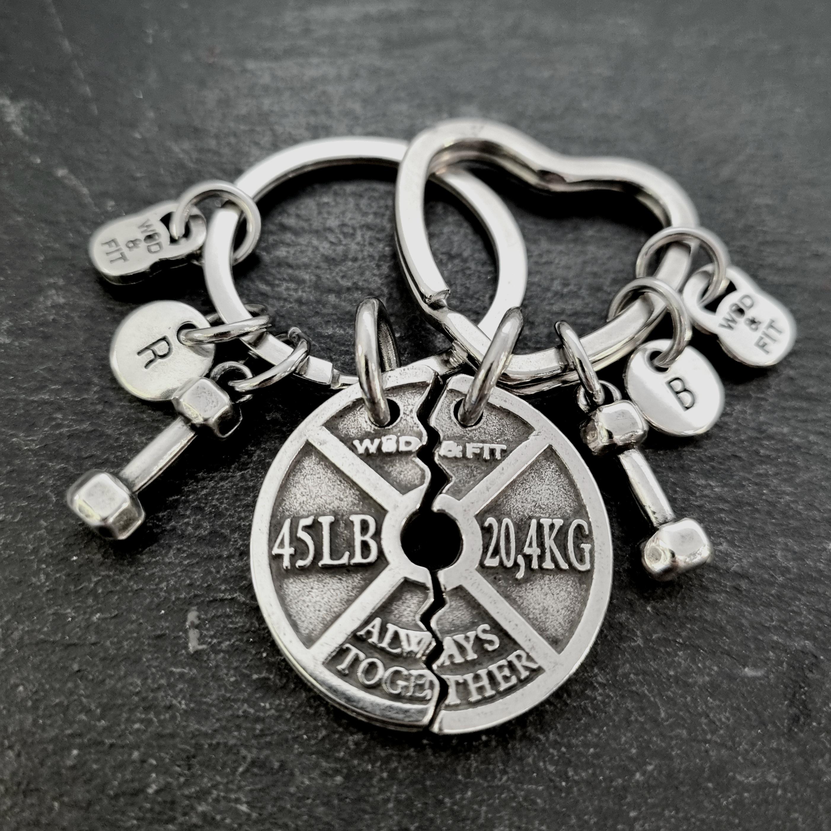 ⭐Couple Keyrings with Weight Plate 45lbs Always Together , Small Dumbbell and yours Initials All in Metall Silver Plated.