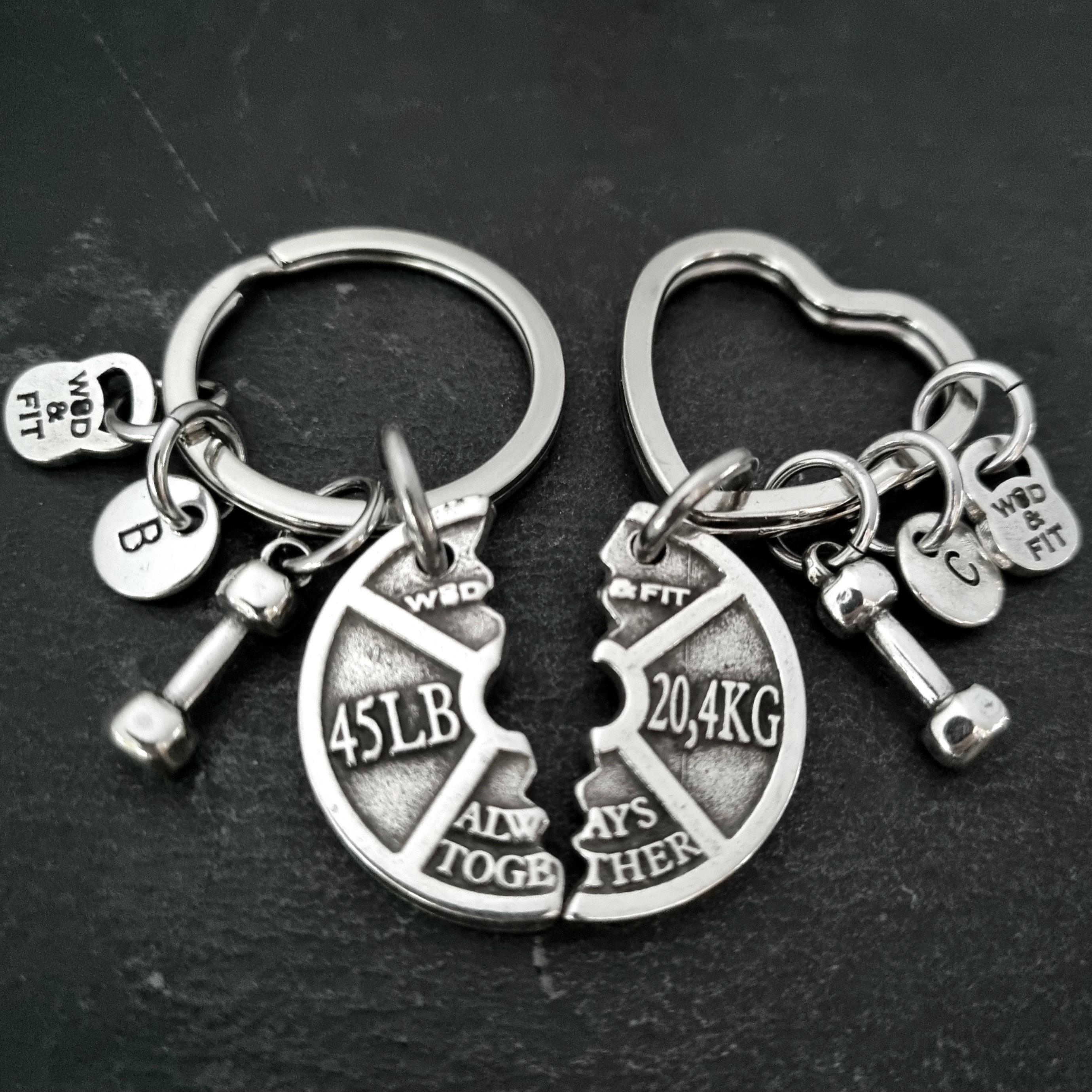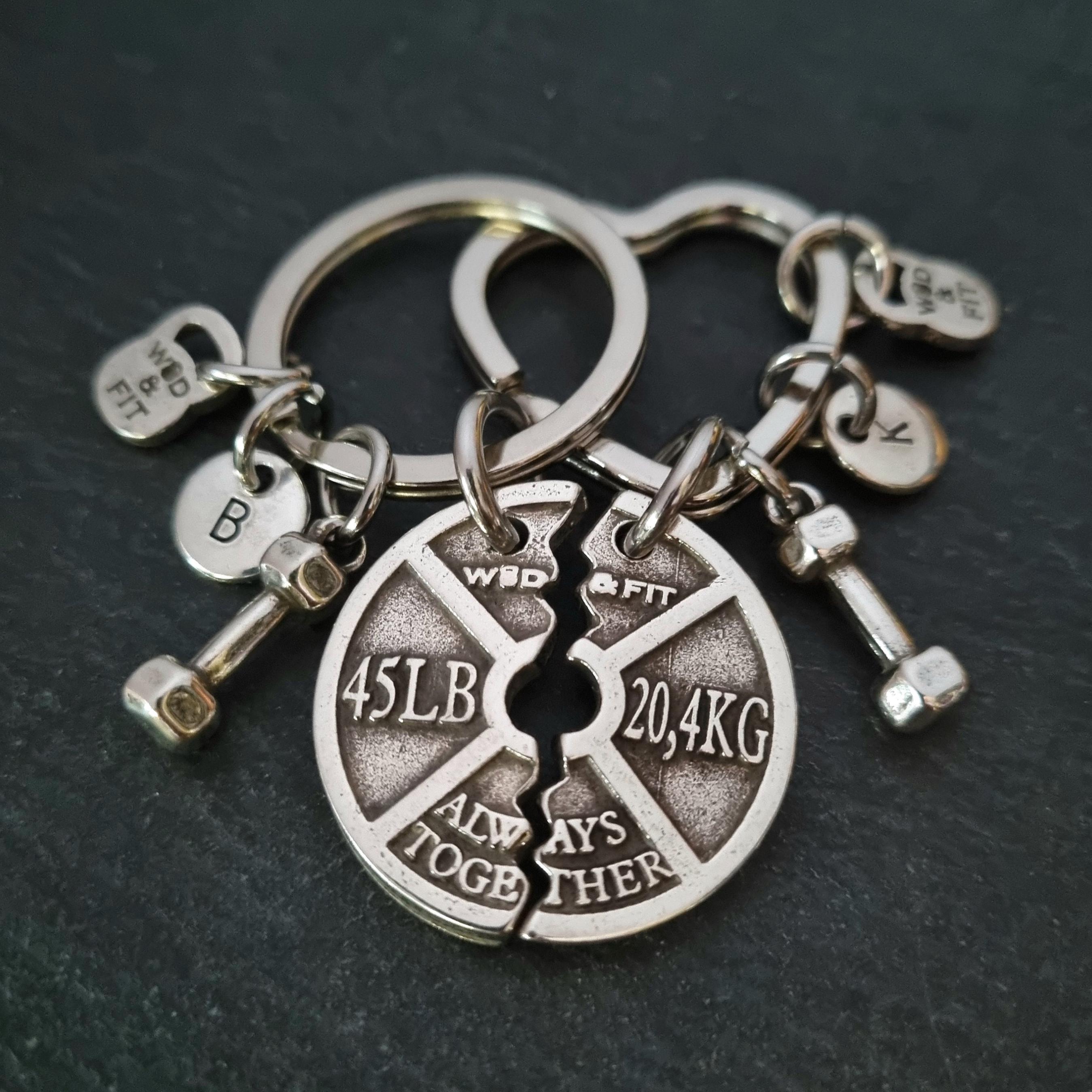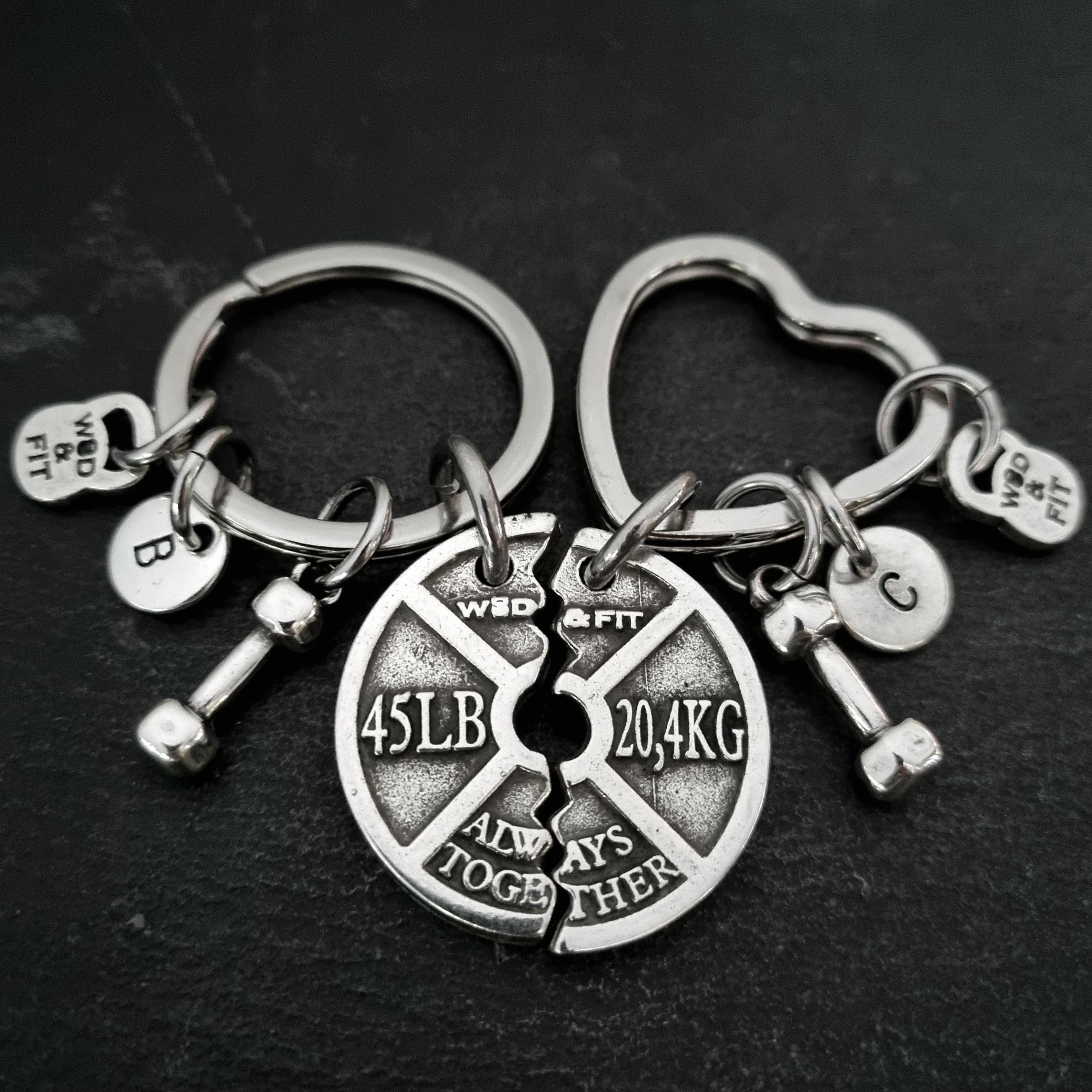 ⭐Couple Keyrings with Weight Plate 45lbs Always Together , Small Dumbbell and yours Initials All in Metall Silver Plated.