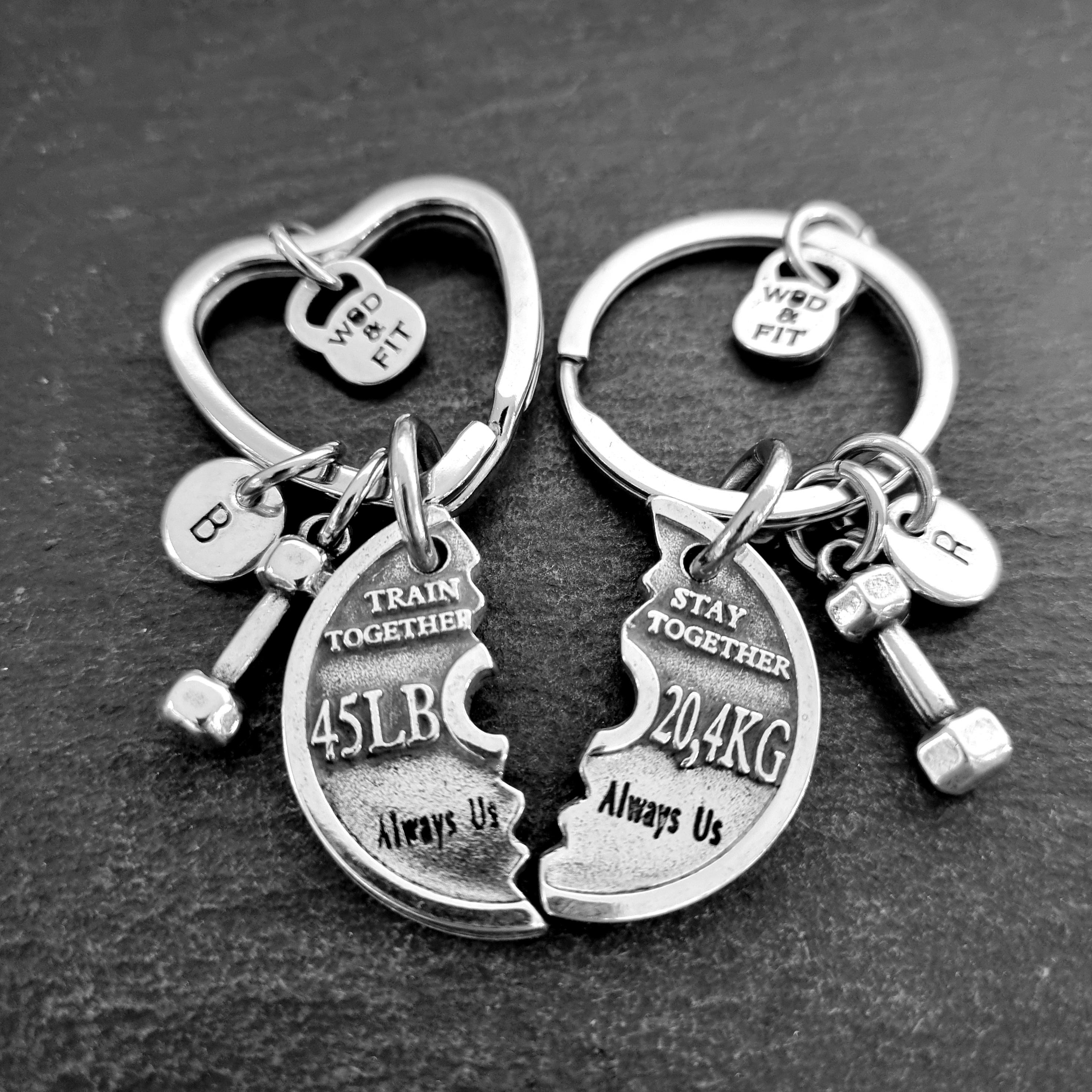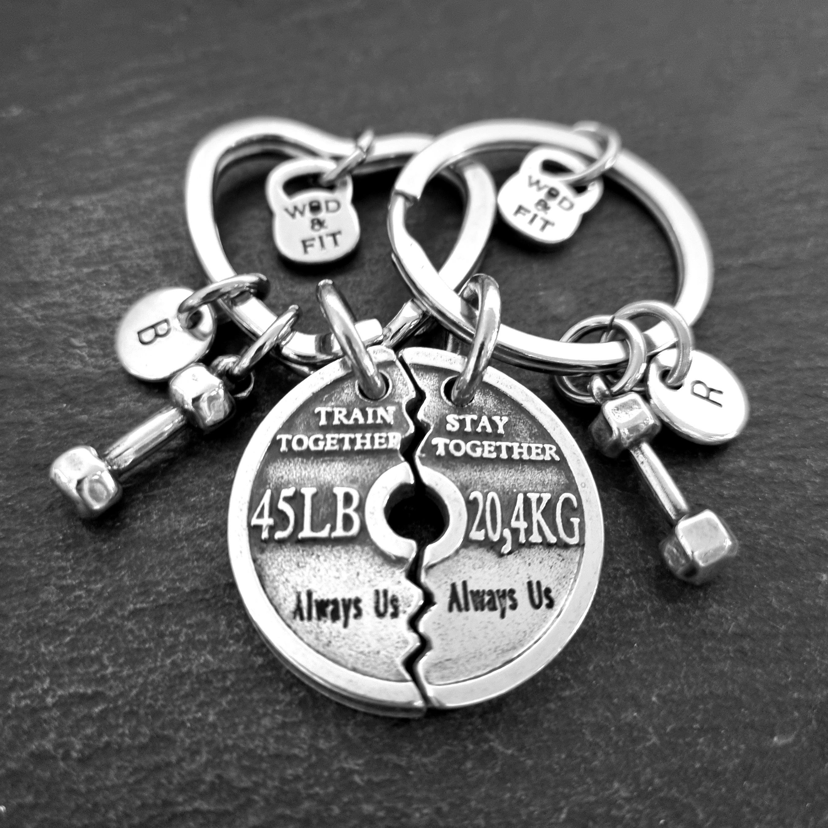 Couple Gym Keyring Weight Plate 45lbs Always Together & Inicial Train Together/ Stay Together With Small Dumbbell by Wod & Fit