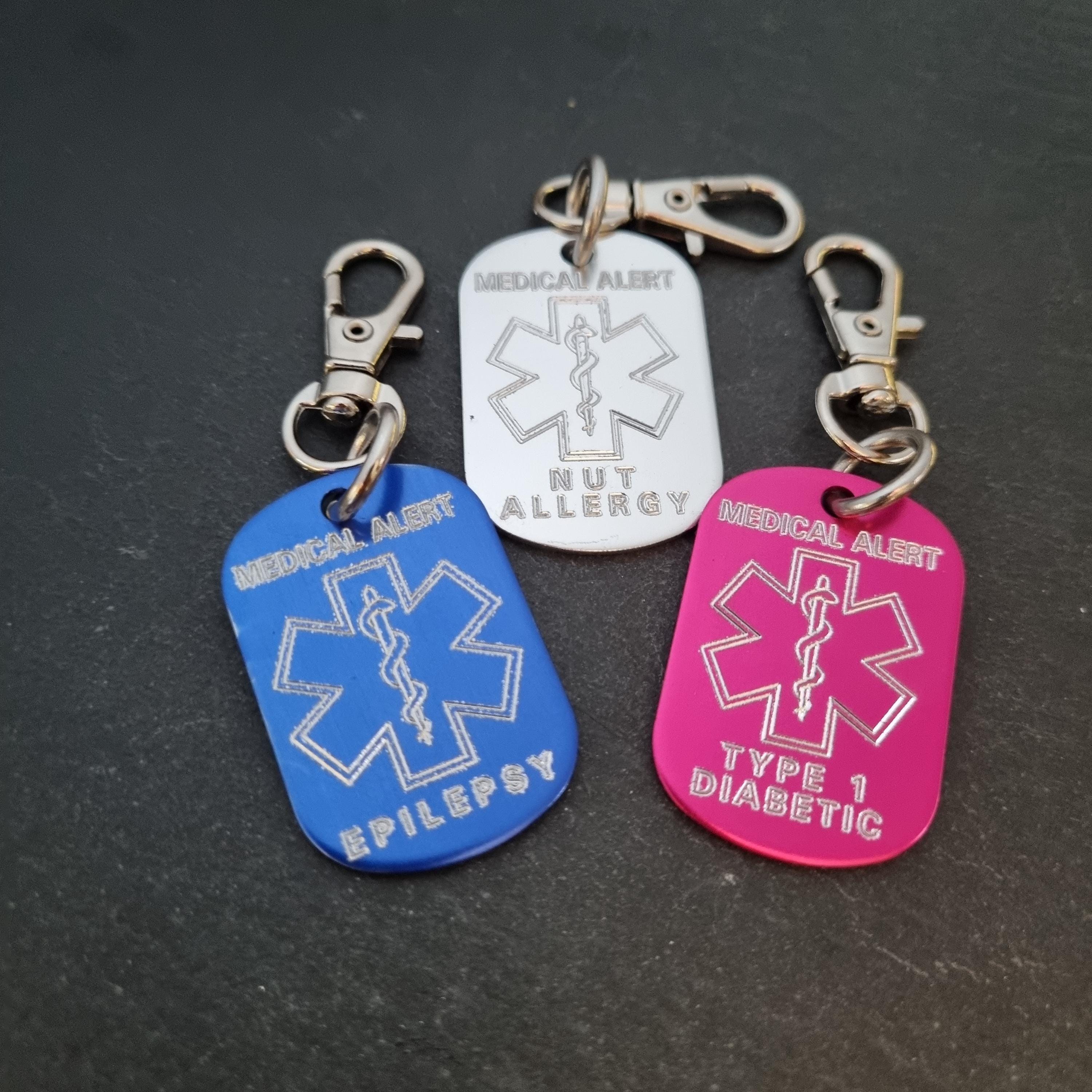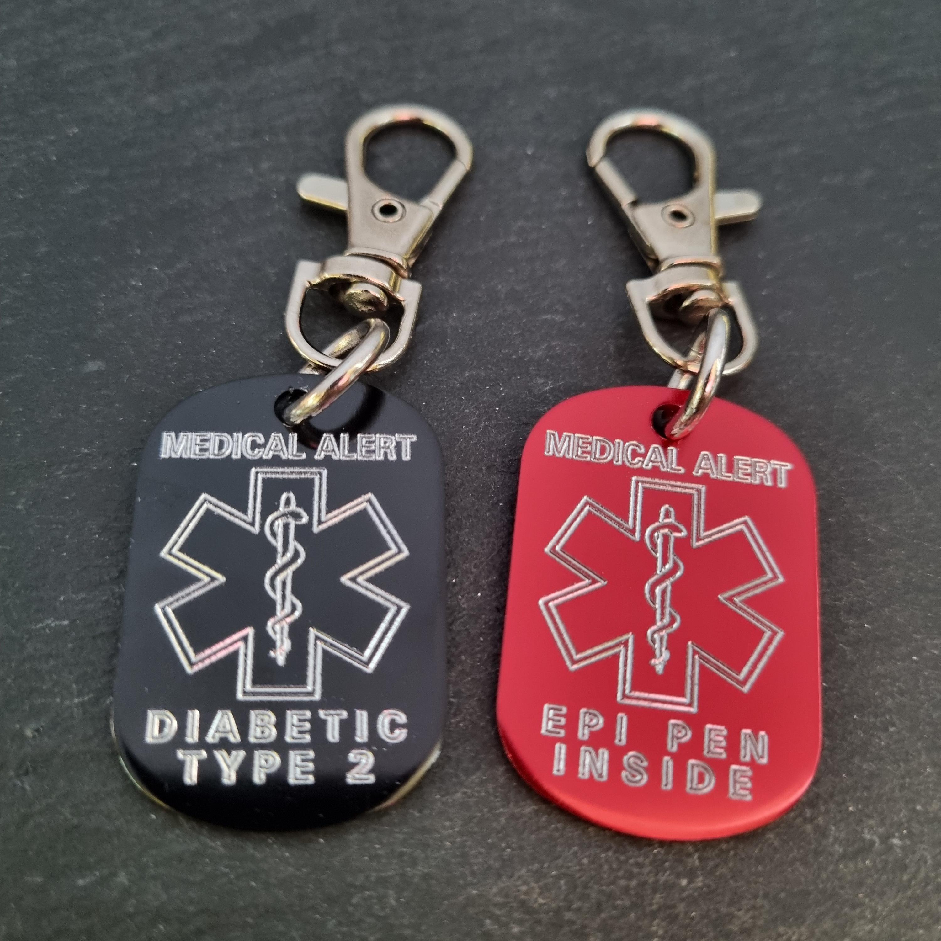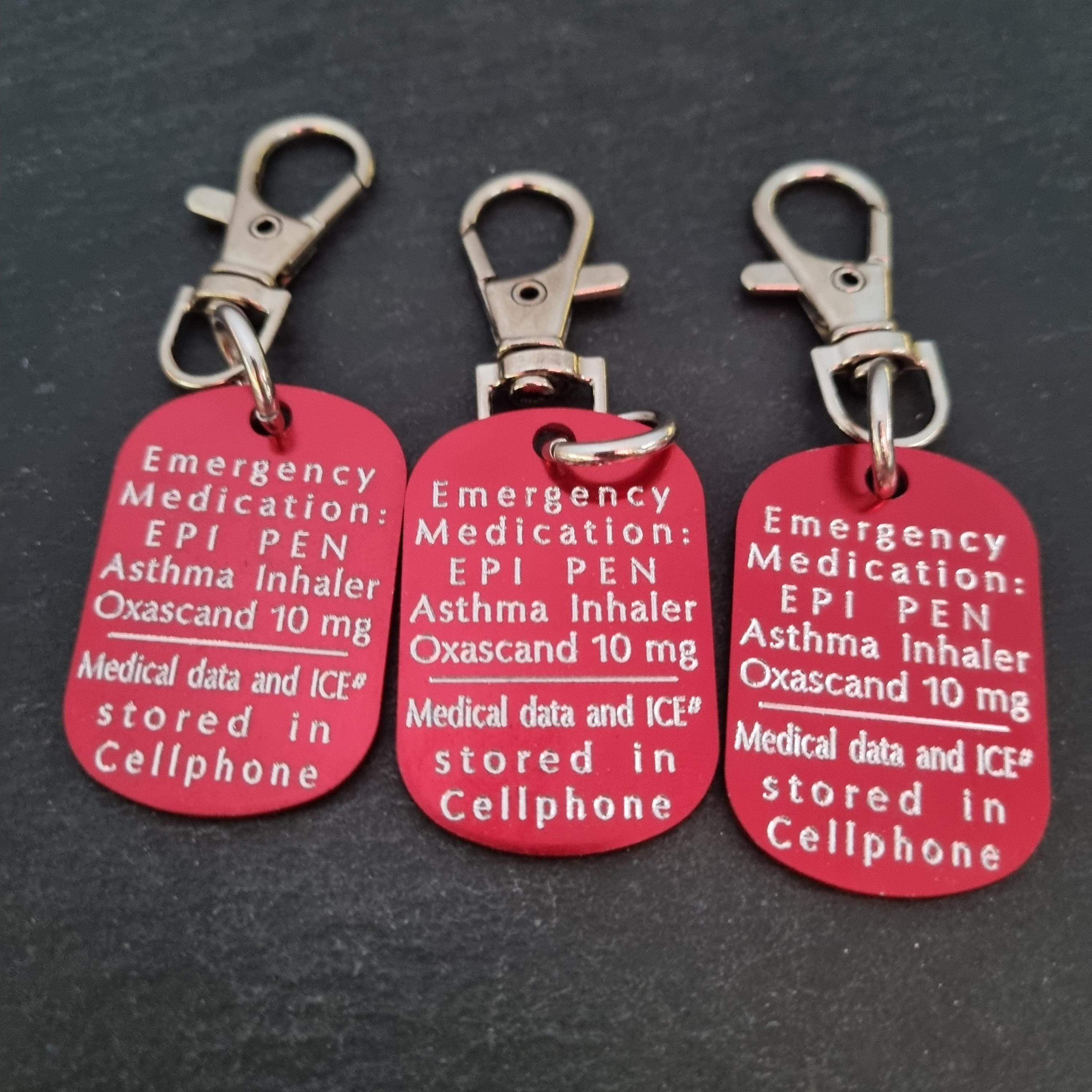 • Personalised medical alert tag for your keys, luggage, bags etc.