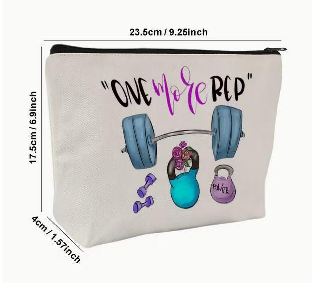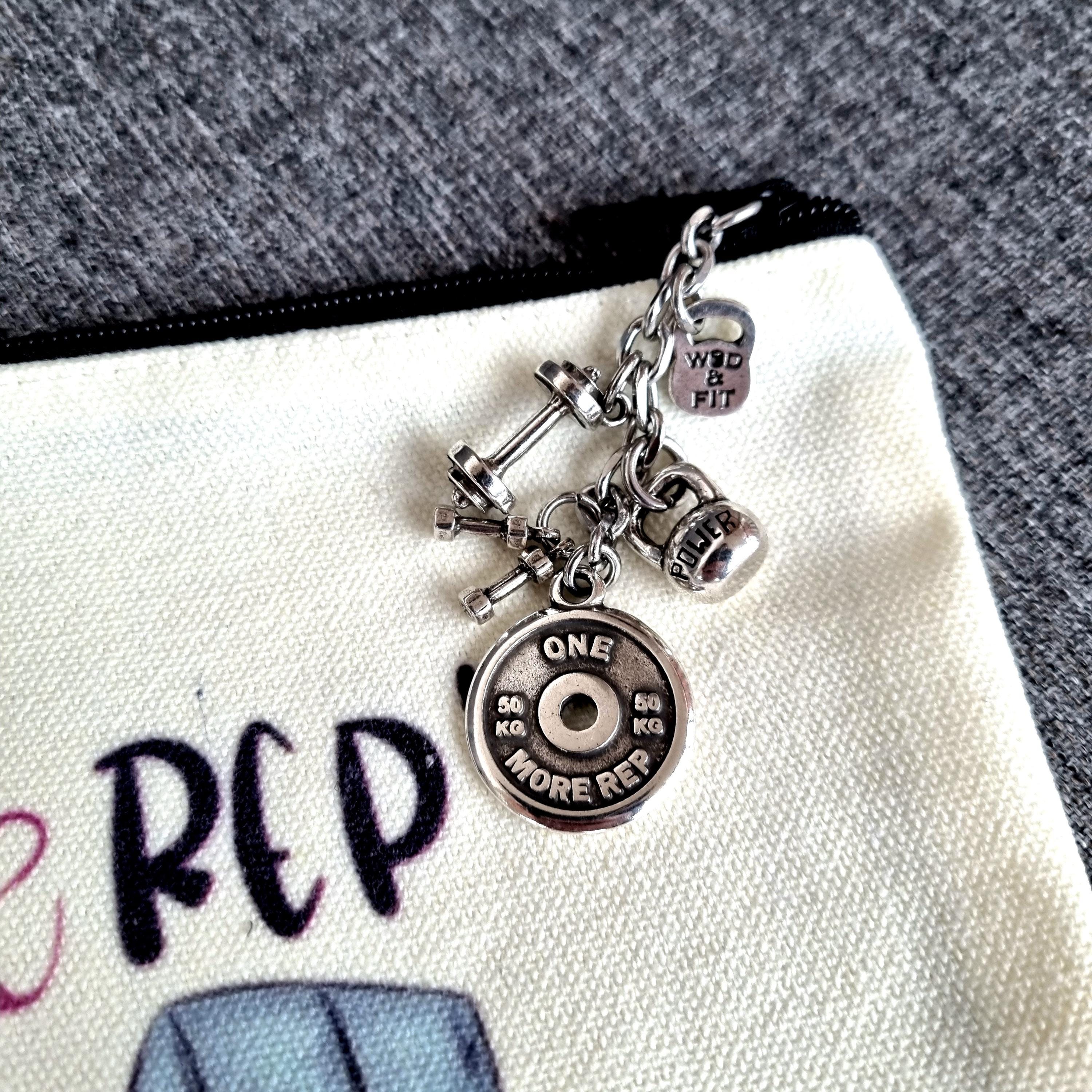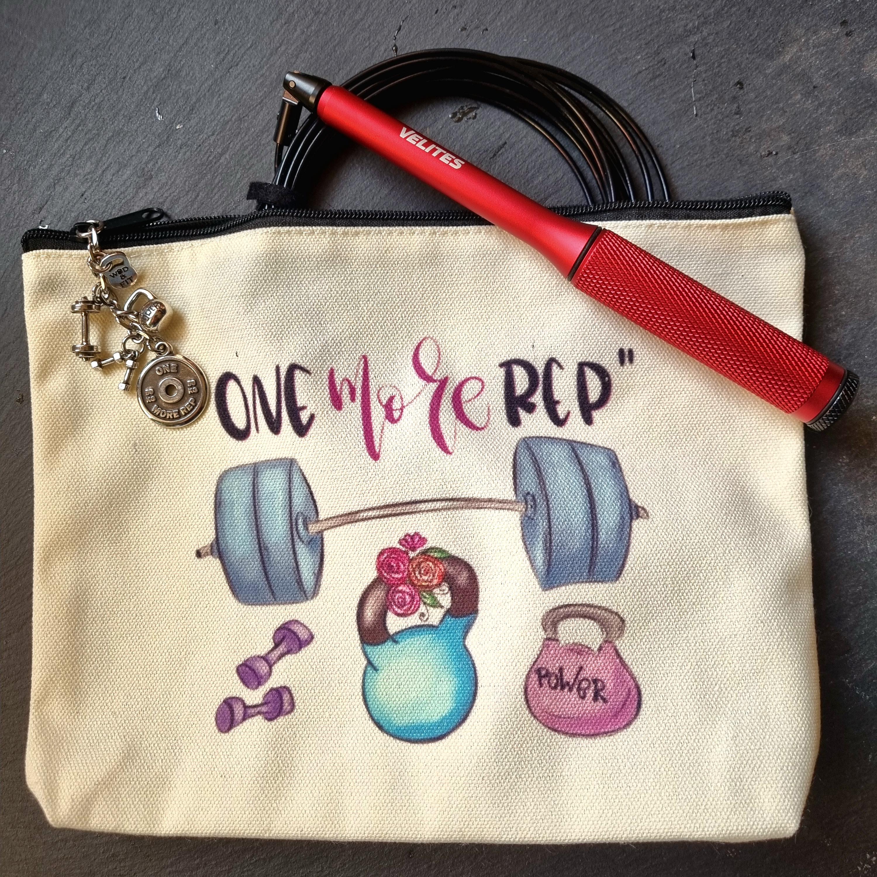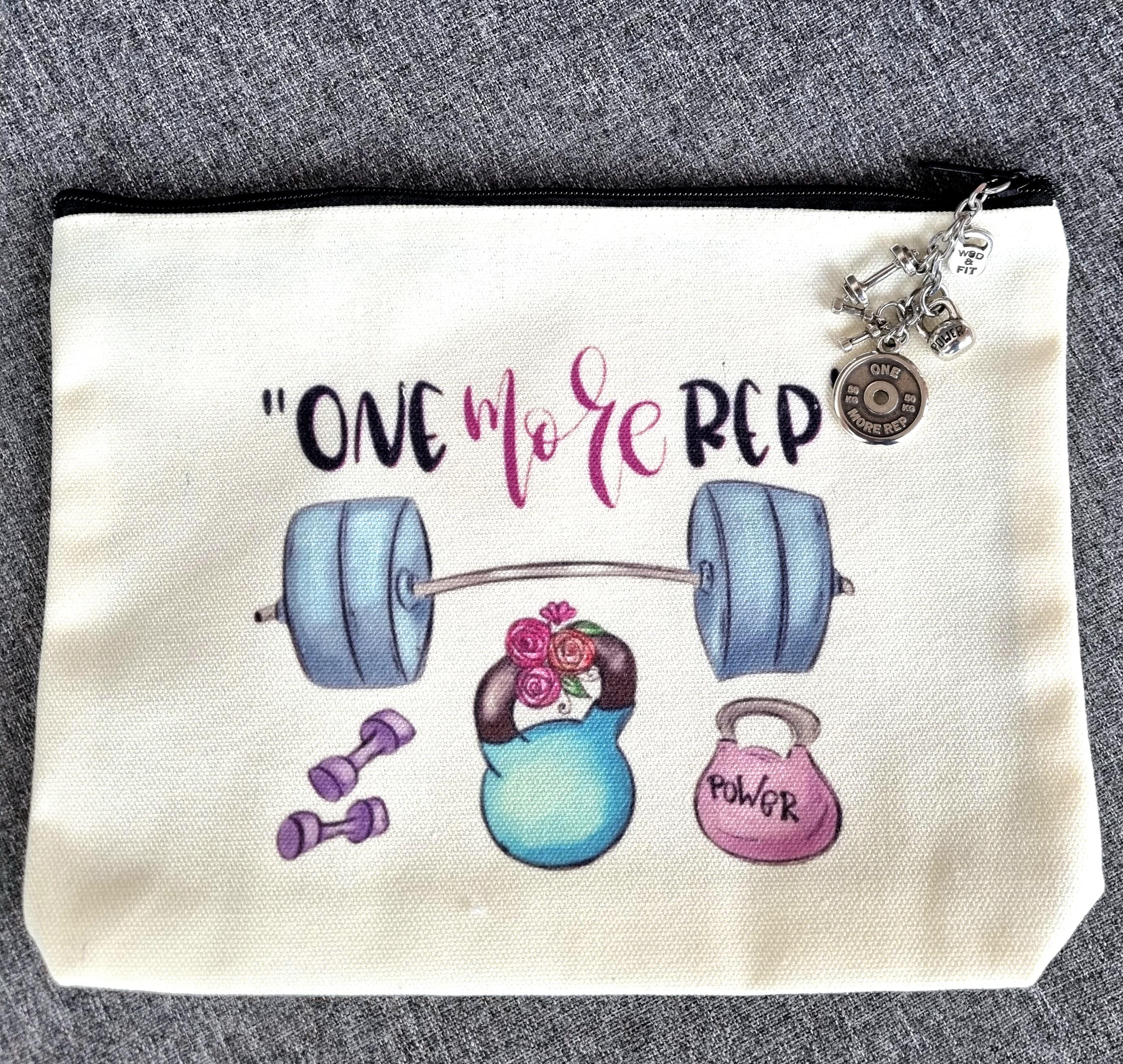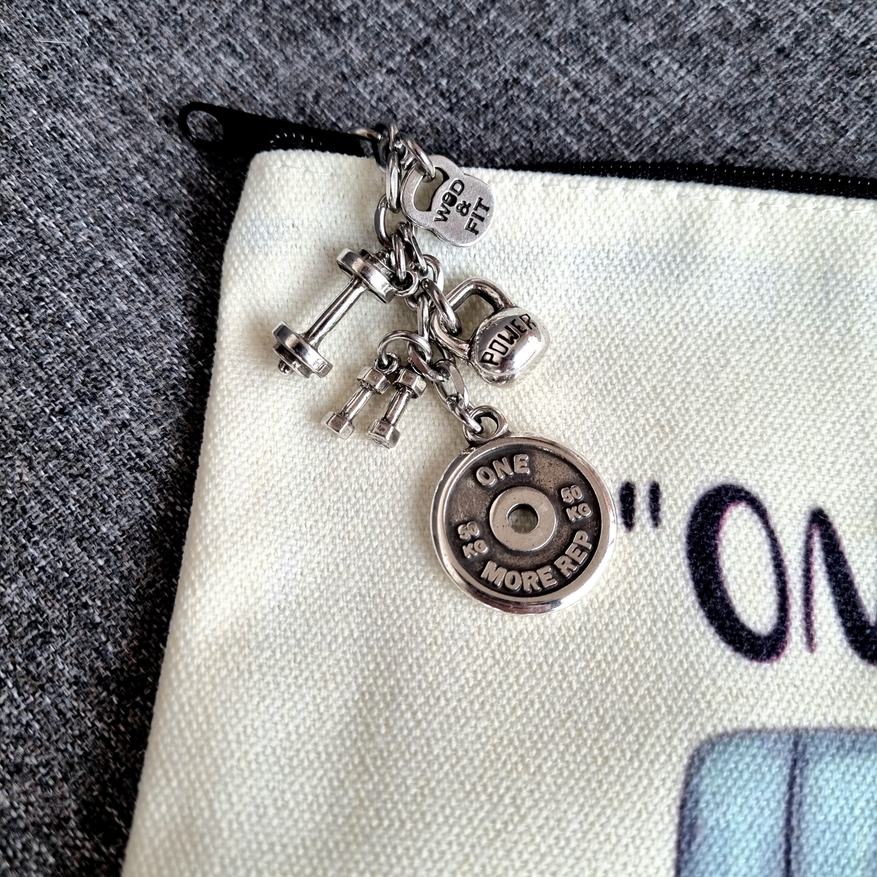 Fabric pouch with a sporty yet stylish design, created for women who live and breathe fitness. Featuring a silver-plated metal charm with “One More Rep” disk and kettlebell, a powerful symbol of strength and perseverance.