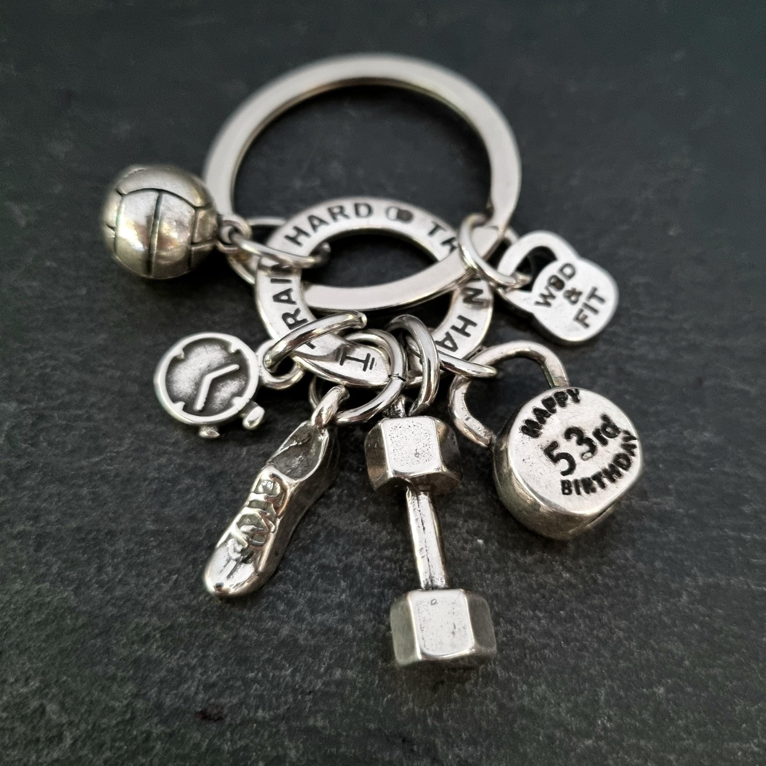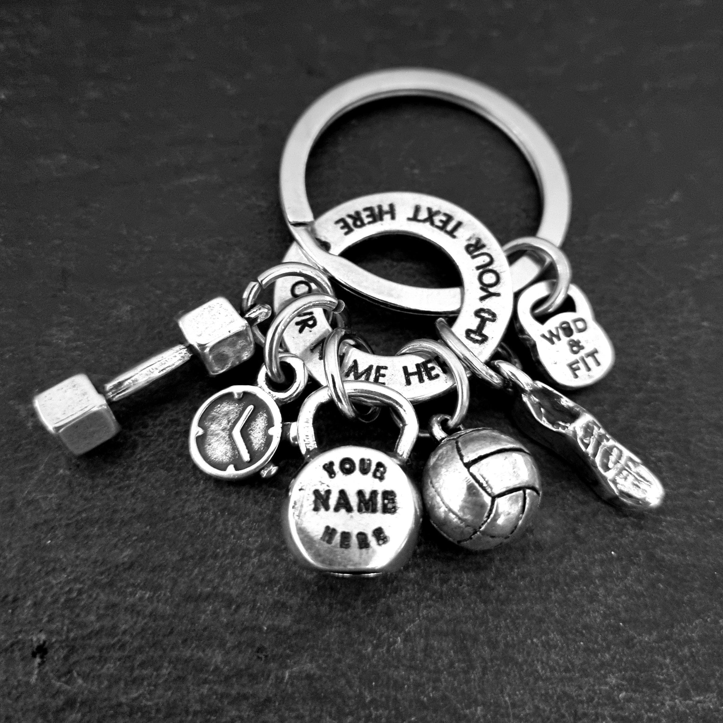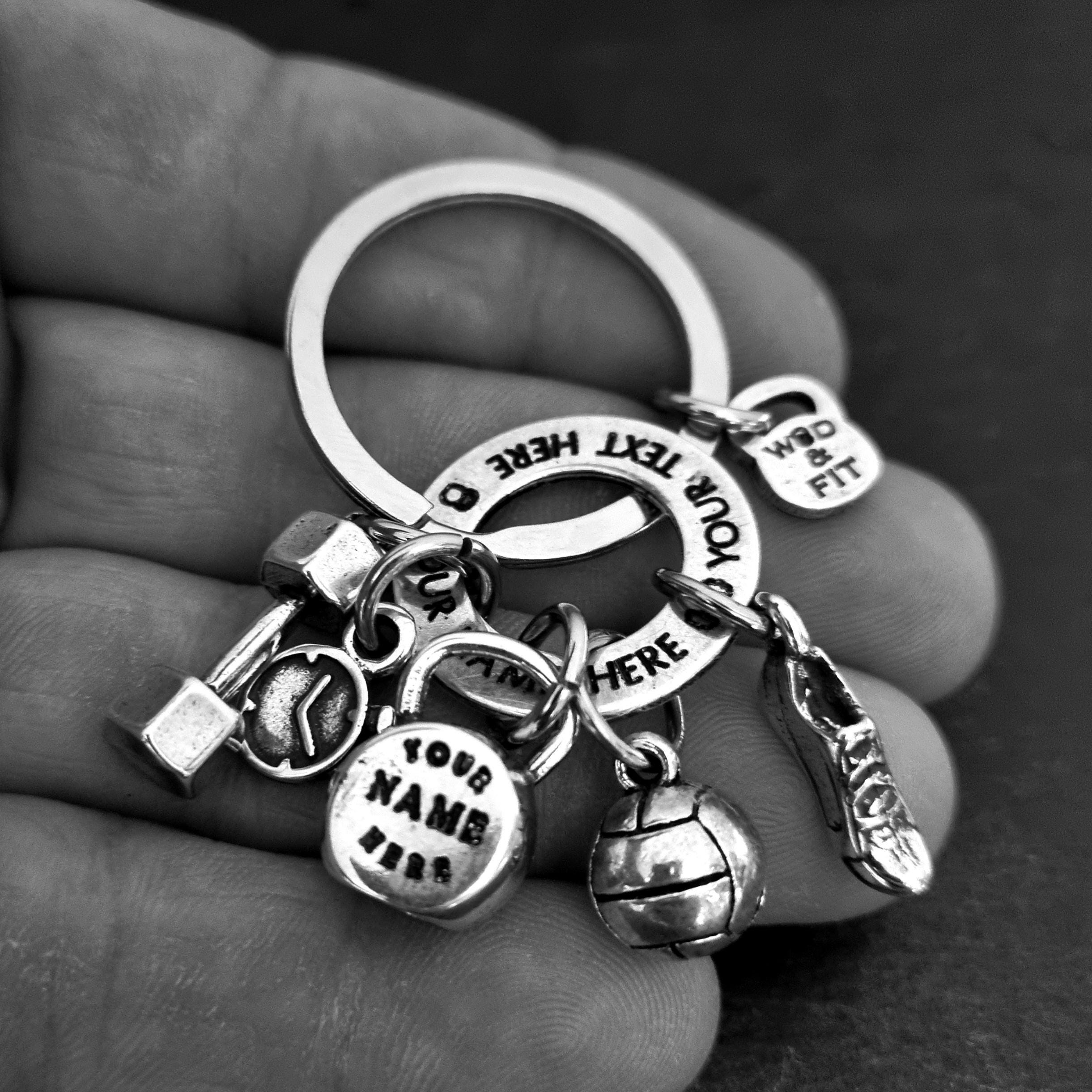 This fully personalized silver metal keychain celebrates the passion for racing, running and strength training.