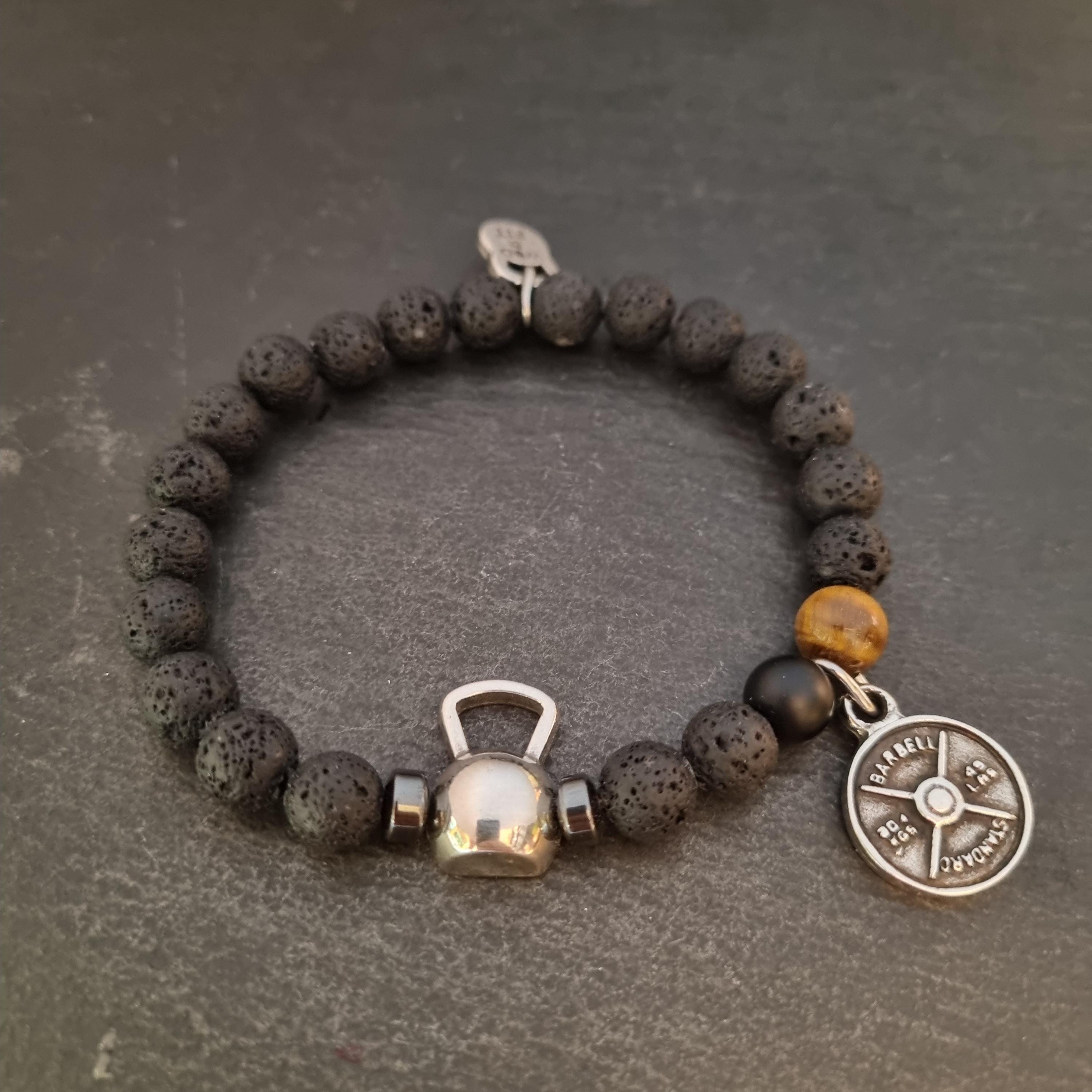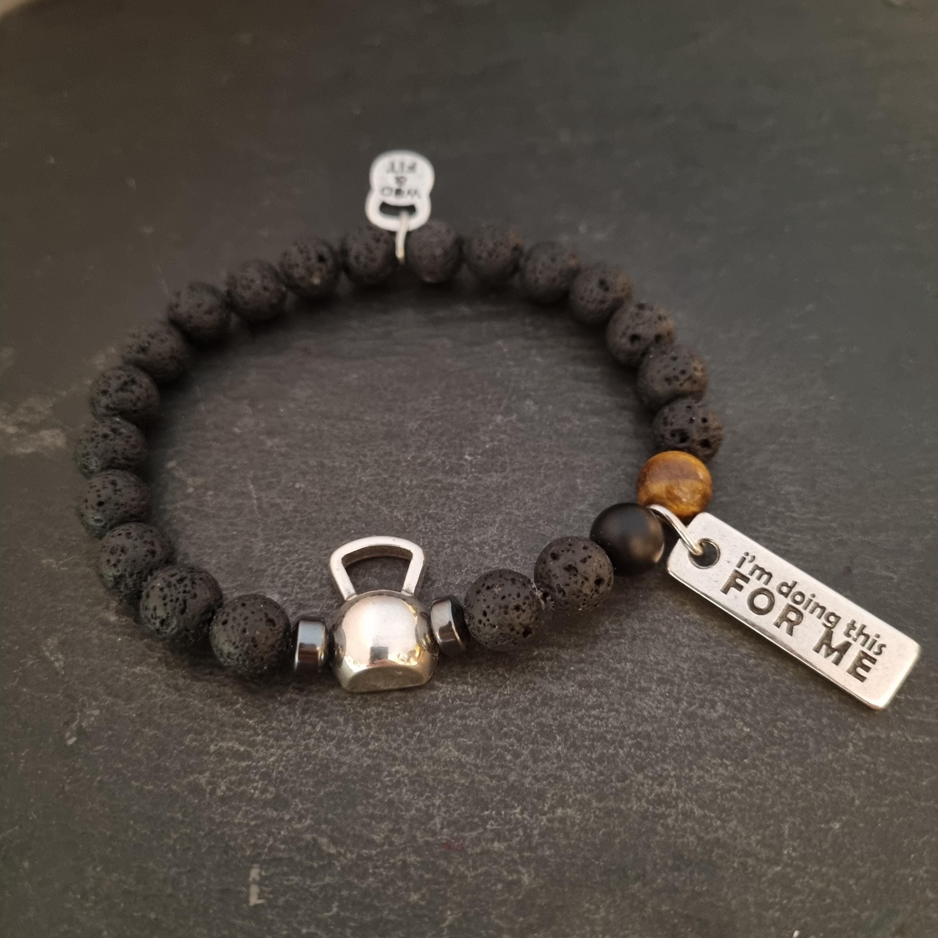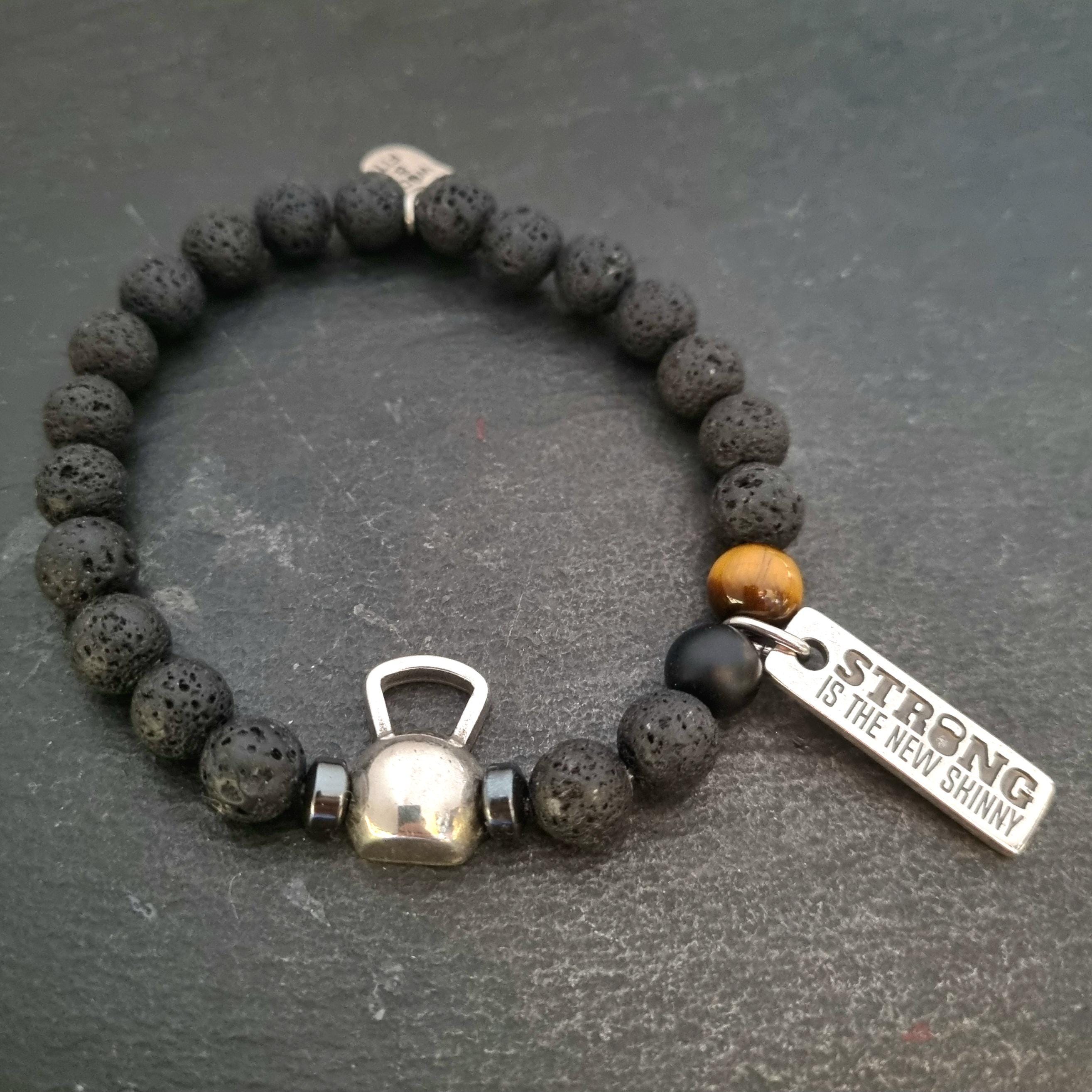 ⭐Elastic unisex bracelet (23inc 5,5cm) with 8mm natural stones : lava stone,tiger eye and agate stone 8mm. with a metal Kettlebell and your favorite Motivational word.