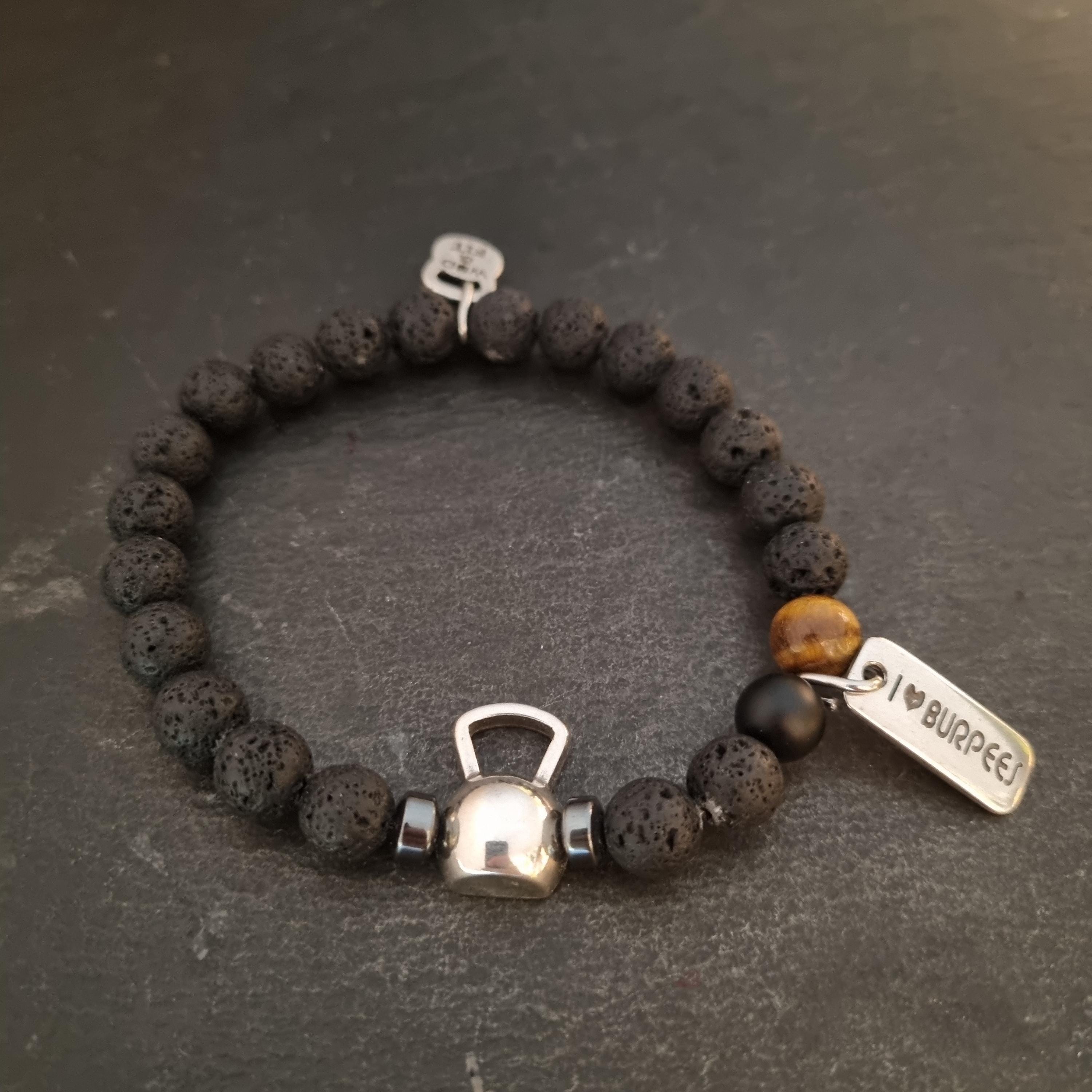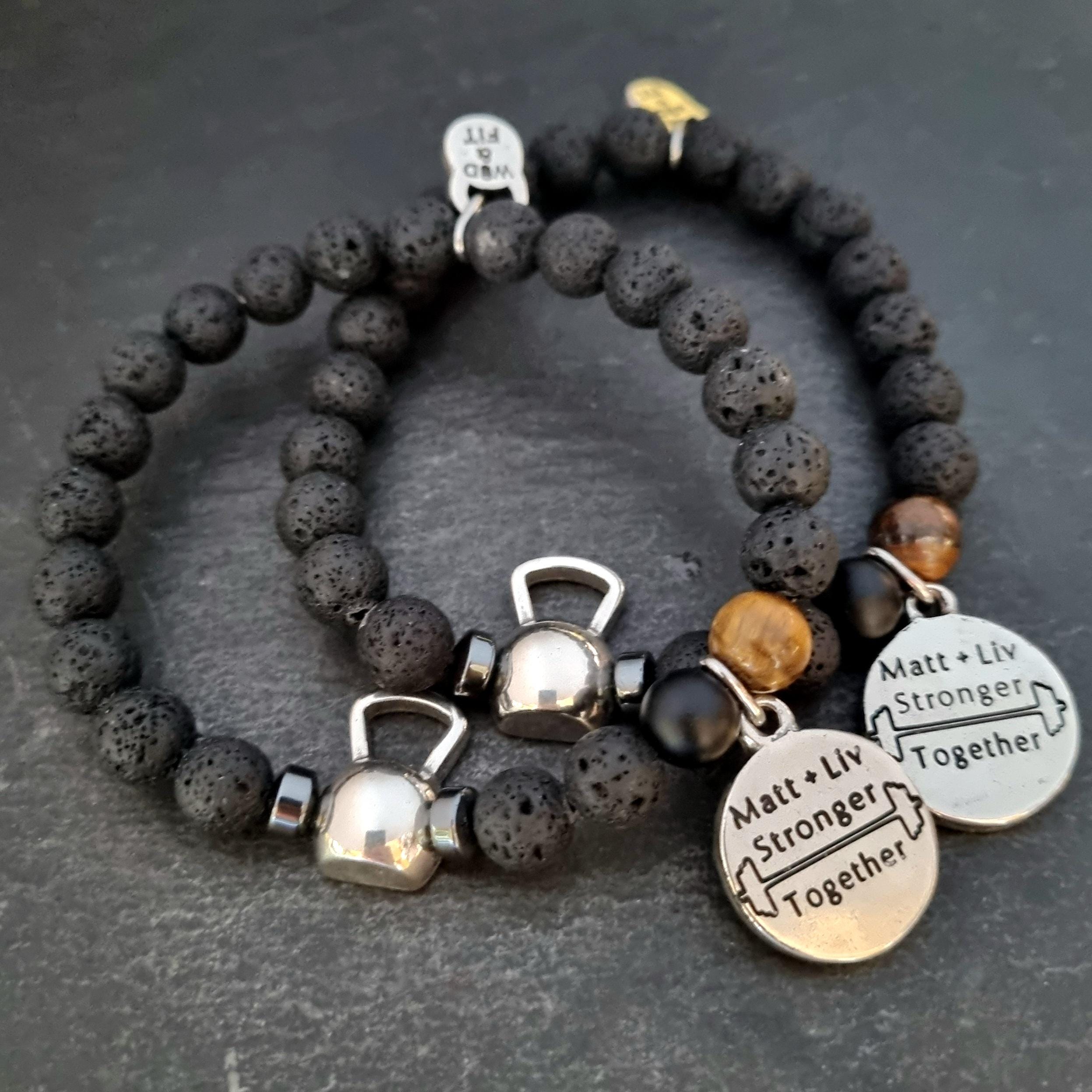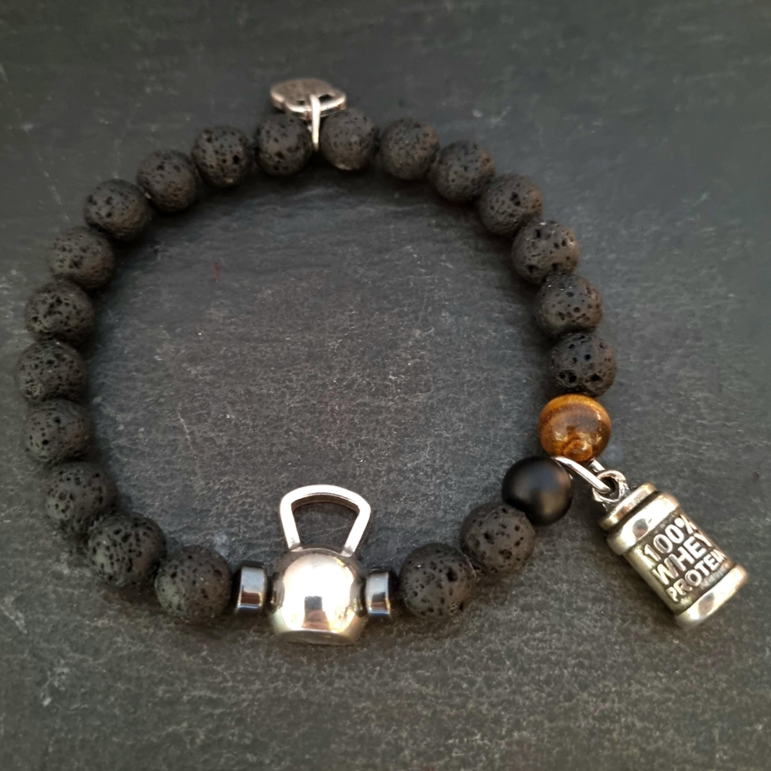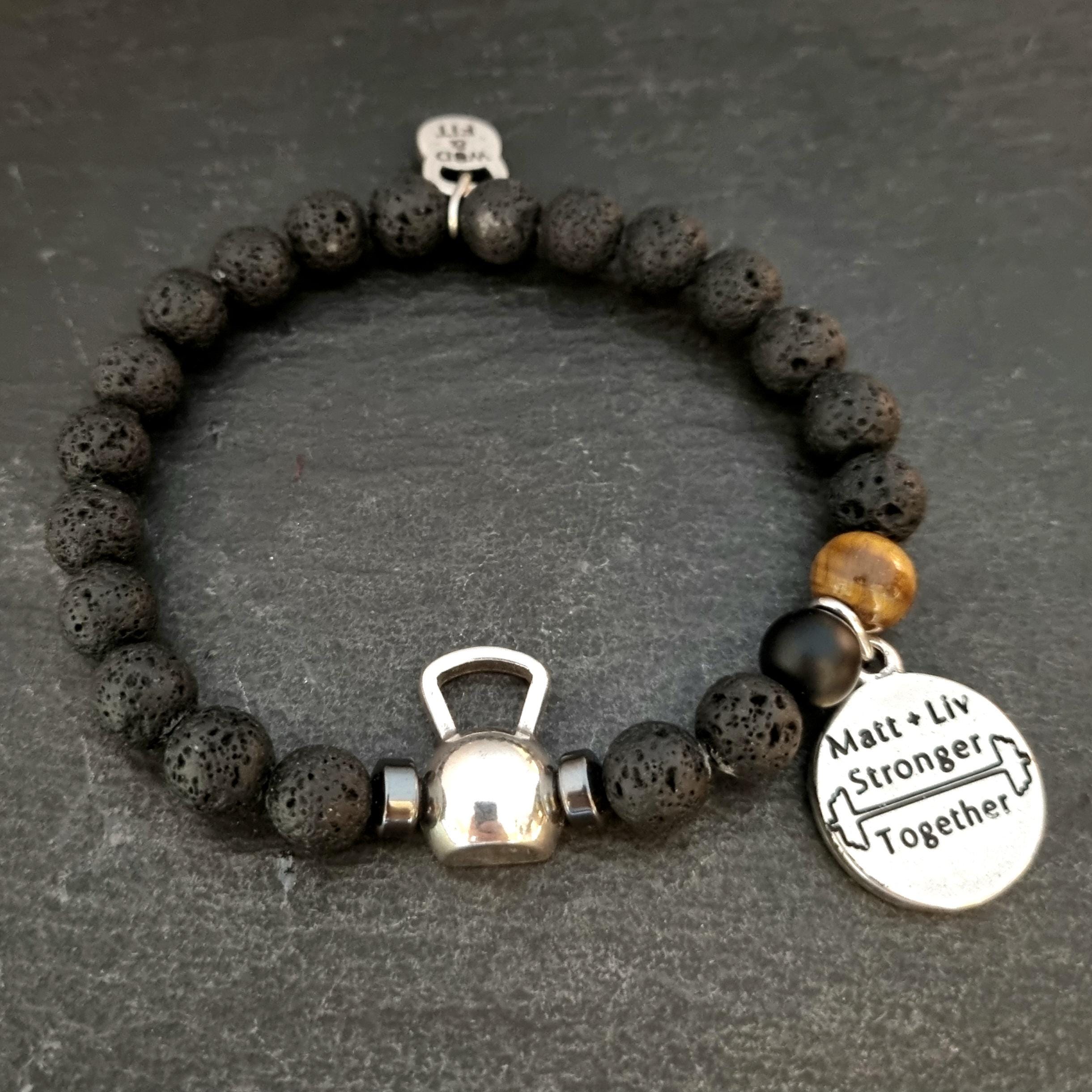 ⭐Elastic unisex bracelet (23inc 5,5cm) with 8mm natural stones : lava stone,tiger eye and agate stone 8mm. with a metal Kettlebell and your favorite Motivational word.