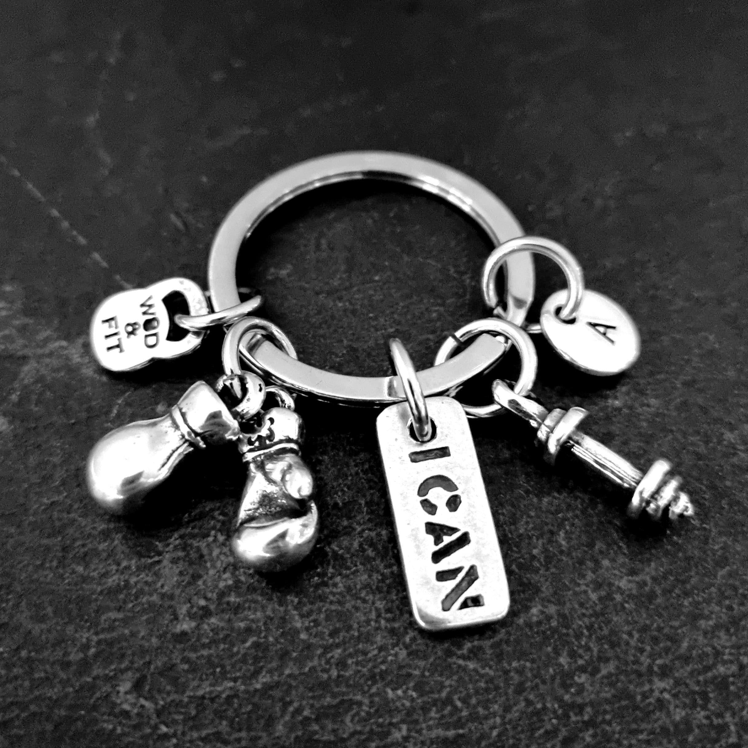 🥊This Keyring has Two Boxing Gloves, Barbell, Motivational Word and Initial Letter