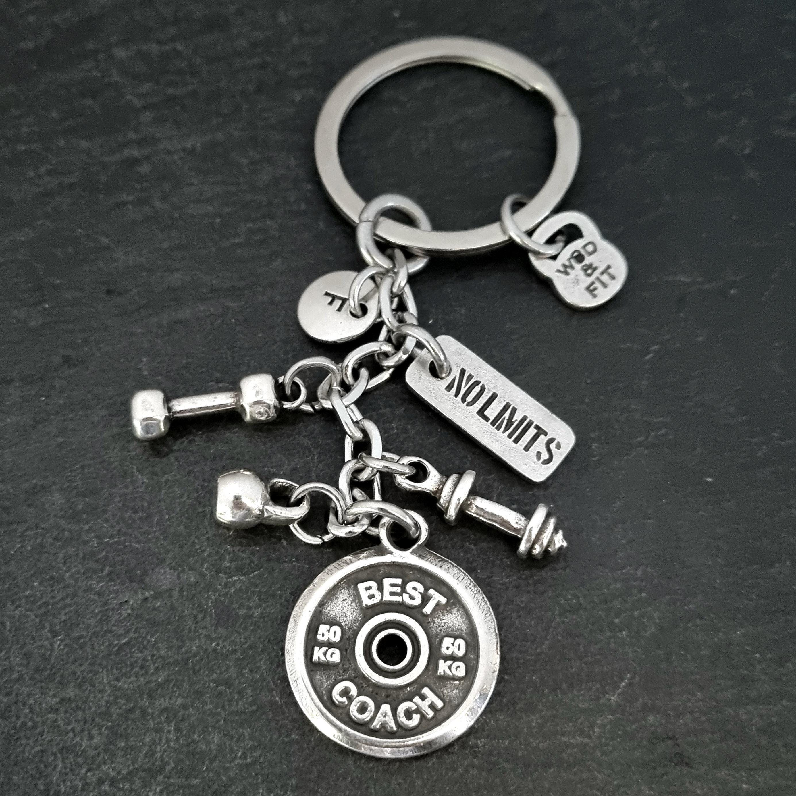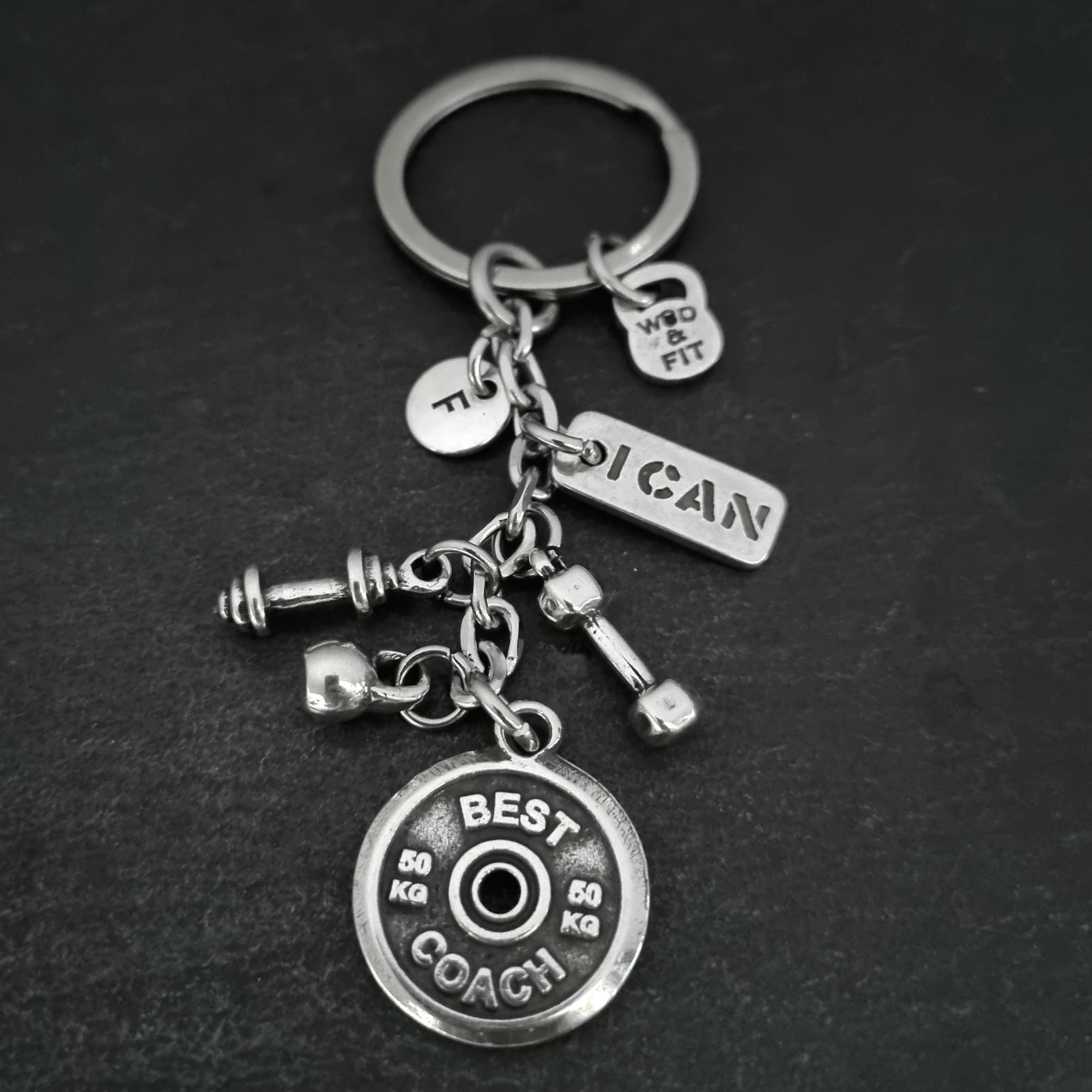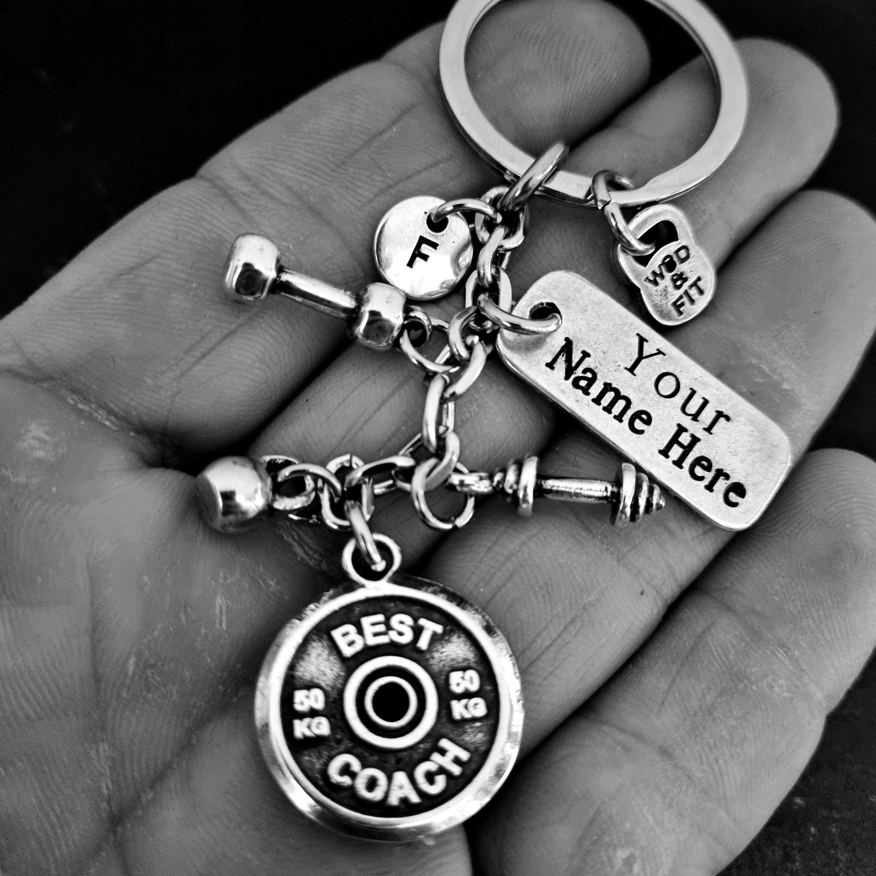 Gym Keychain Best Coach Custom Gym gift Keychain BEST COACH Workout Gift with Motivation, Dumbell Hex, Barbell, Kettlebell & Initial by Wod & Fit