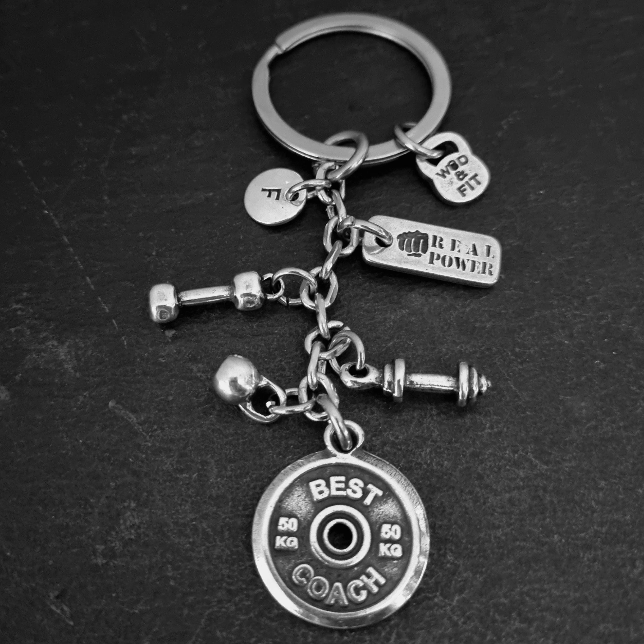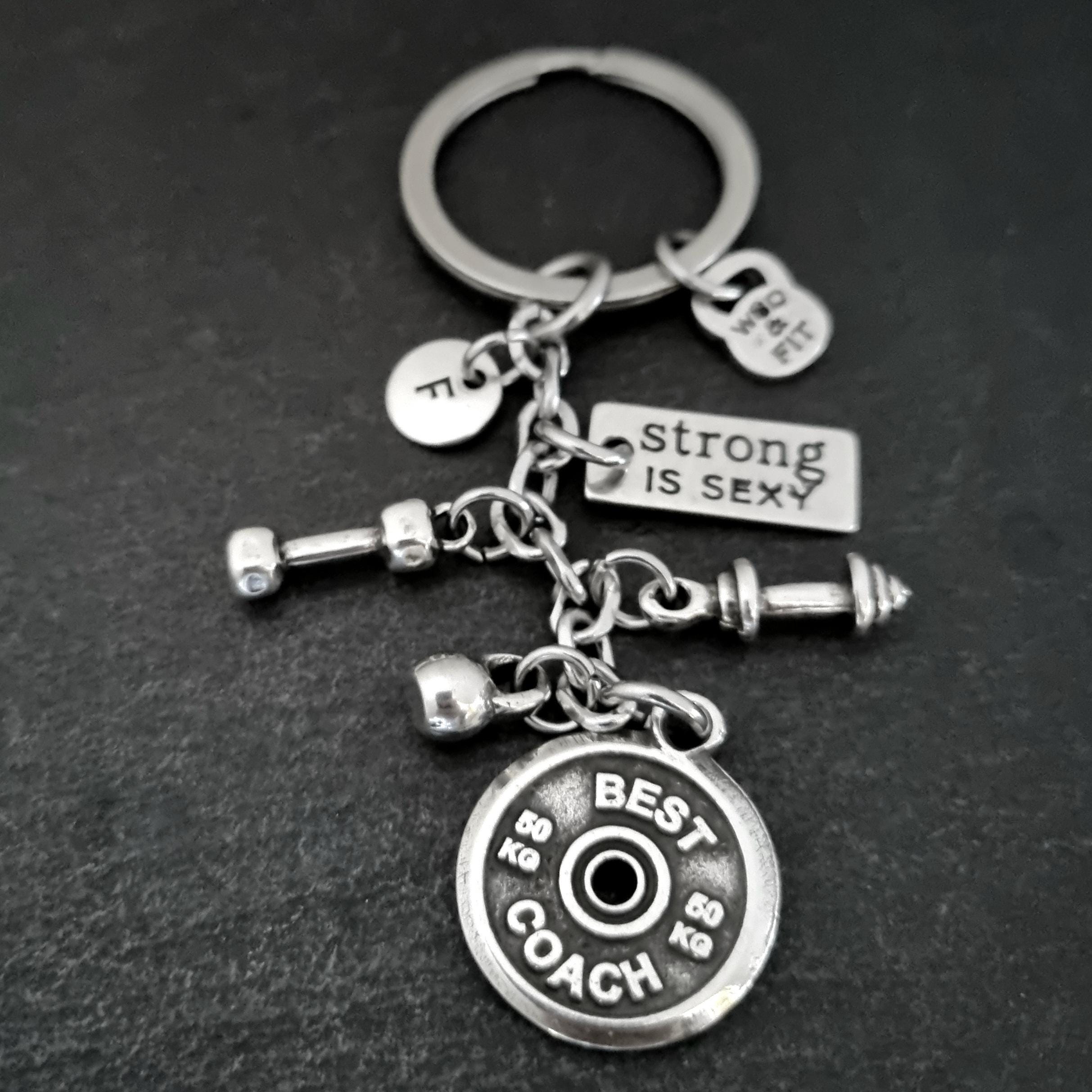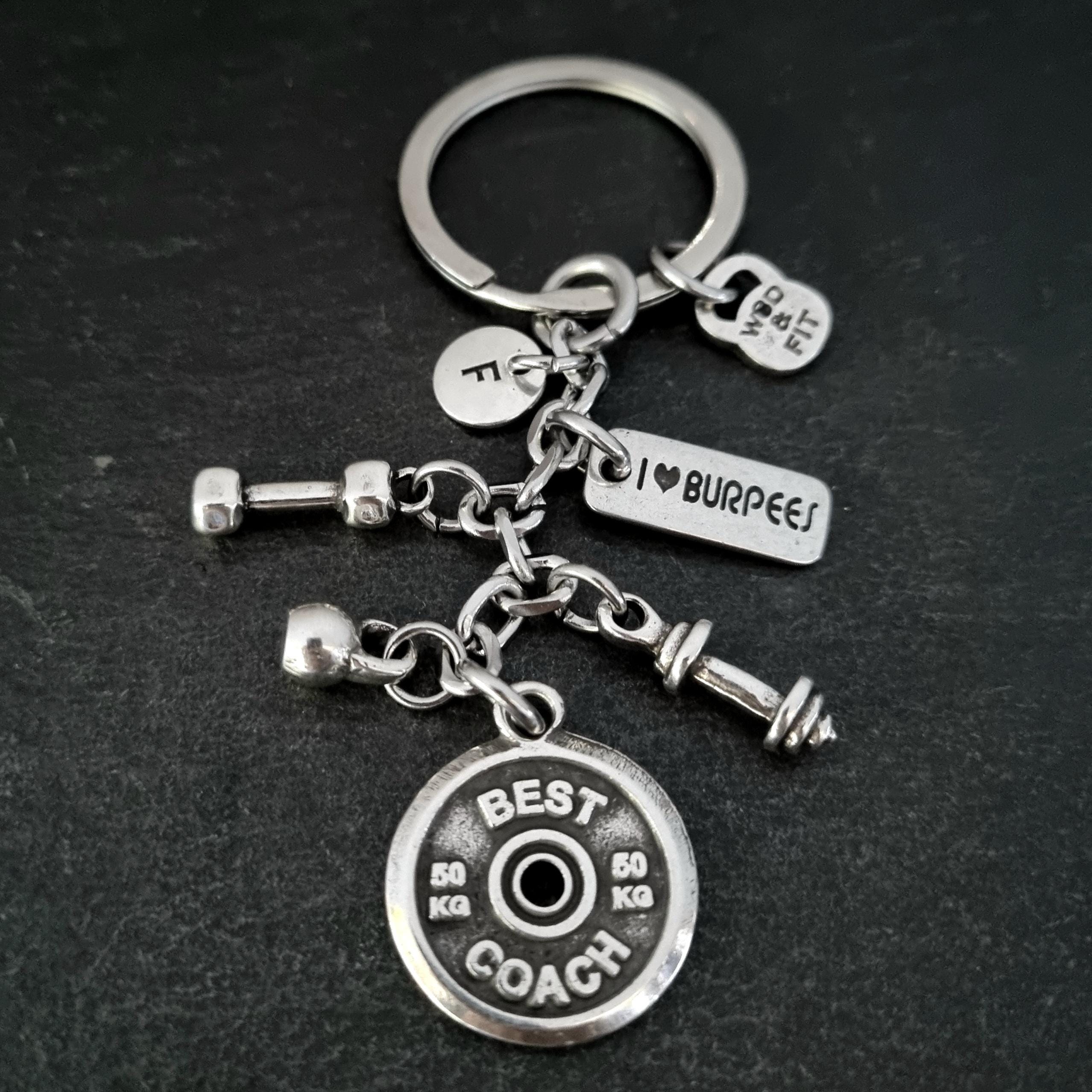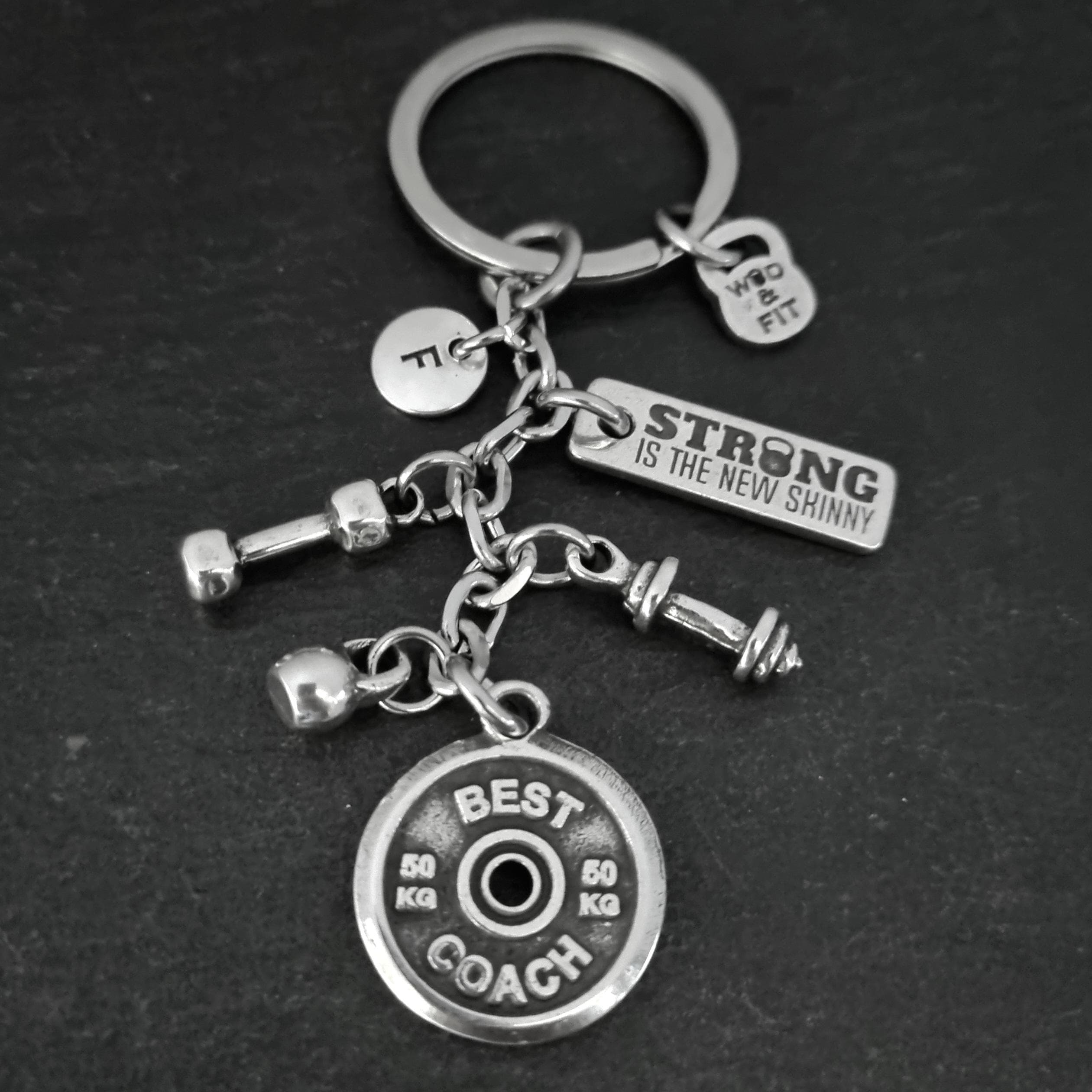 Gym Keychain Best Coach Custom Gym gift Keychain BEST COACH Workout Gift with Motivation, Dumbell Hex, Barbell, Kettlebell & Initial by Wod & Fit