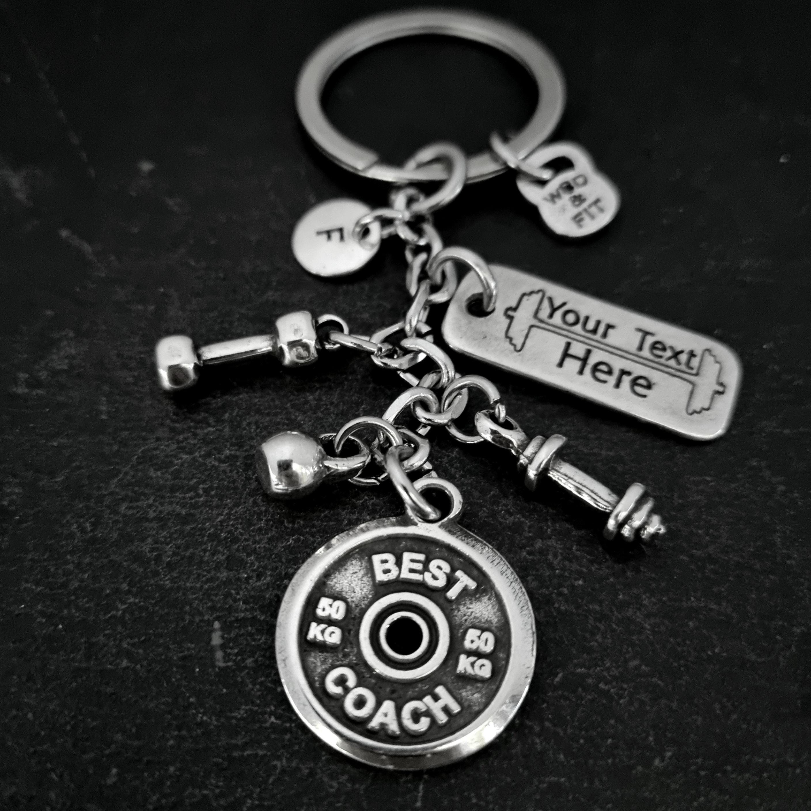 ⭐GYM Keychain With Weight Plate BEST COACH, Dumbbell, Barbell, Kettlebell your Motivational Word and initial.