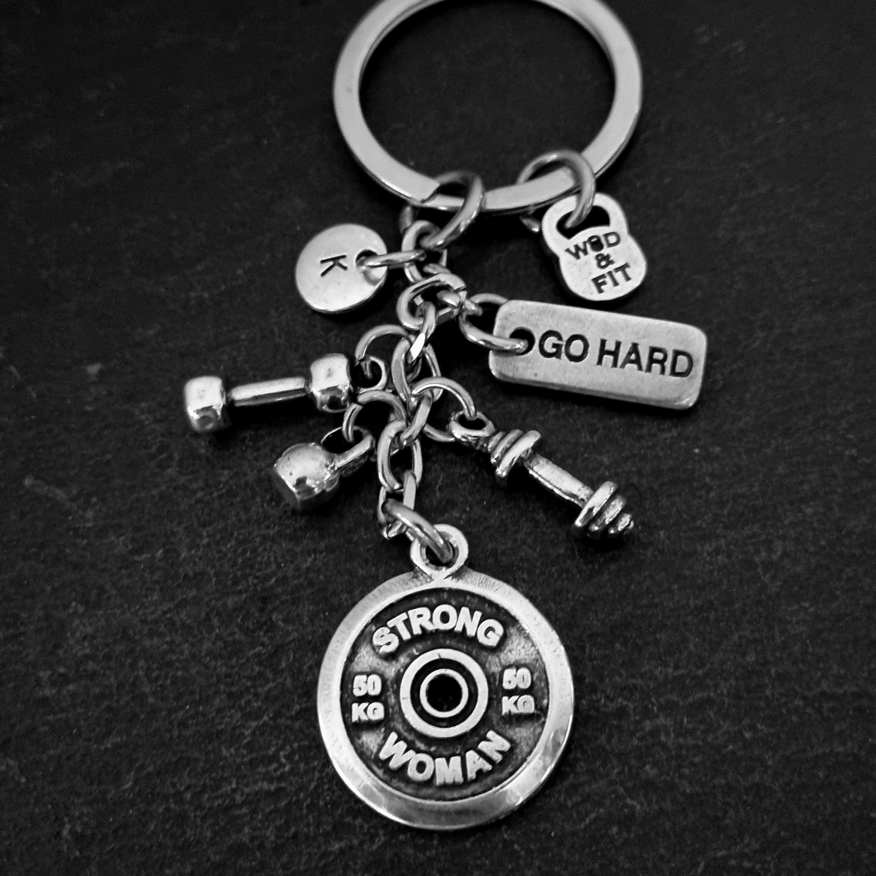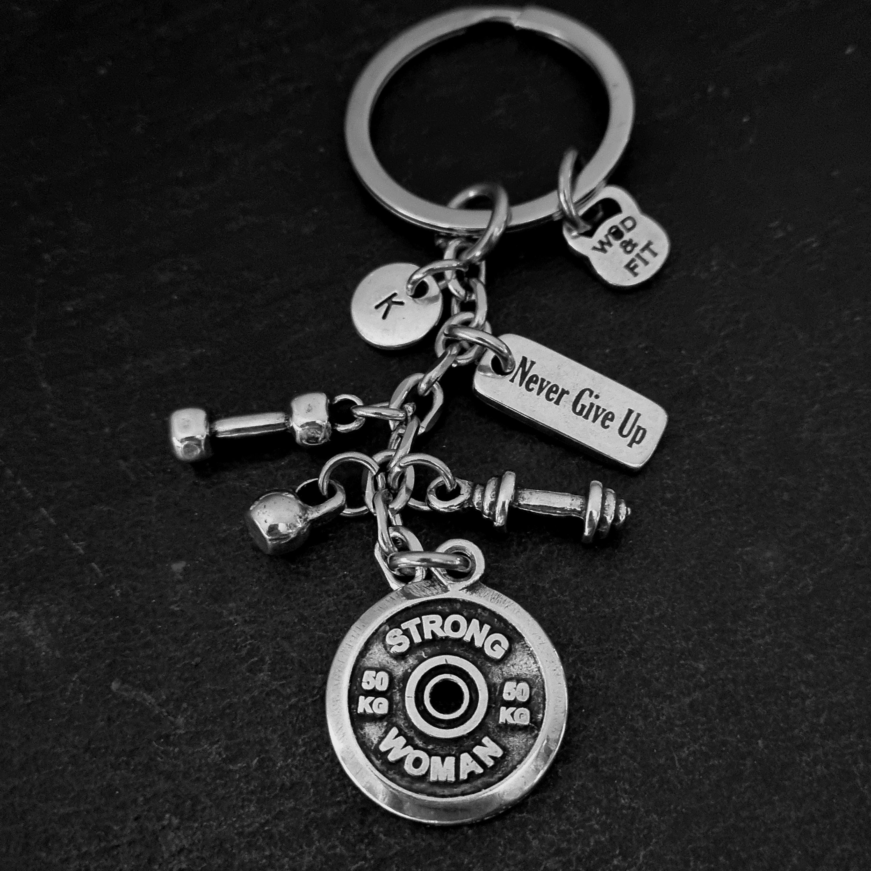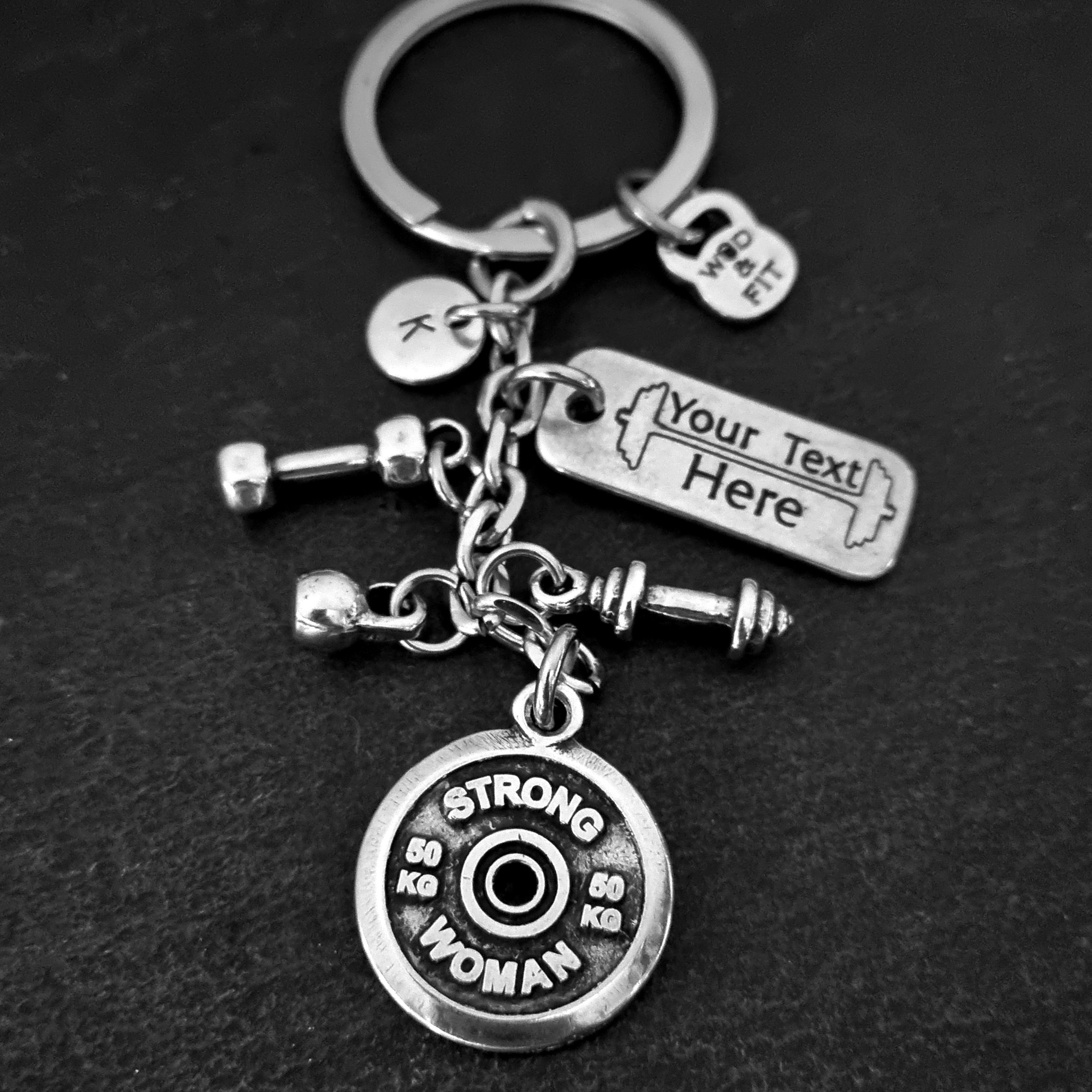 ⭐Gym Keychain With Weight Plate STRONG WOMAN, Dumbbell, Barbell, Kettlebell your Motivational Word and initial letter.