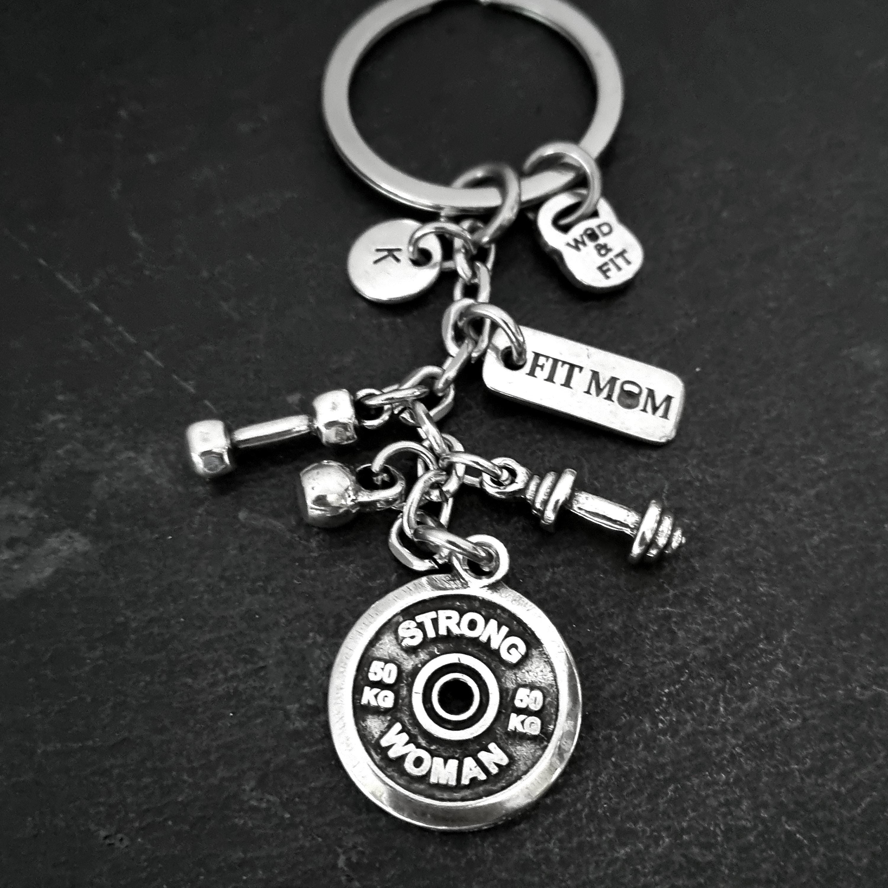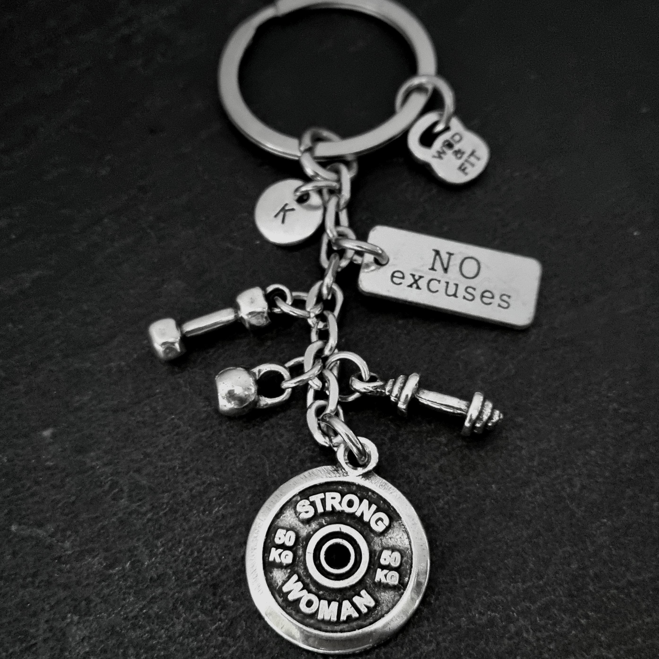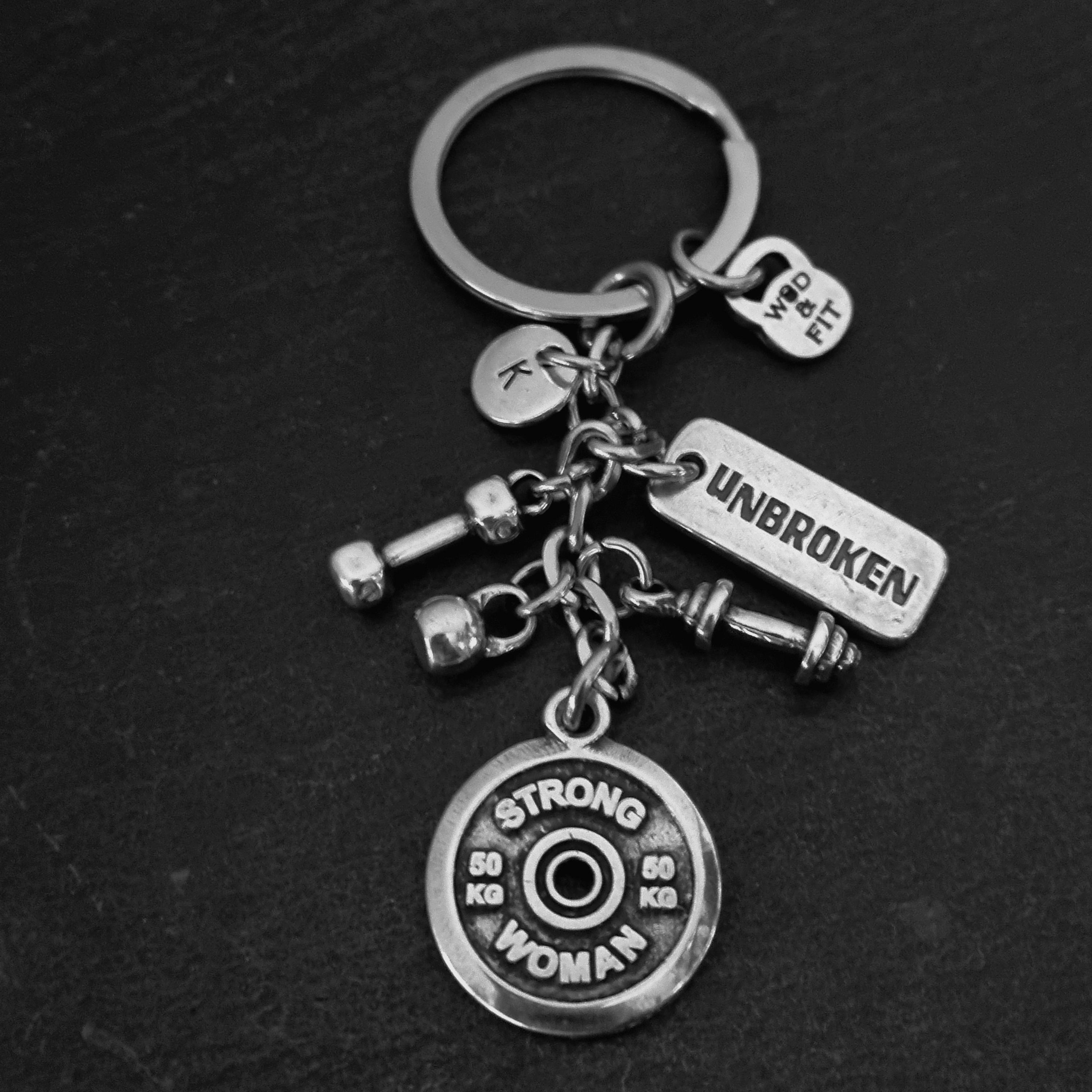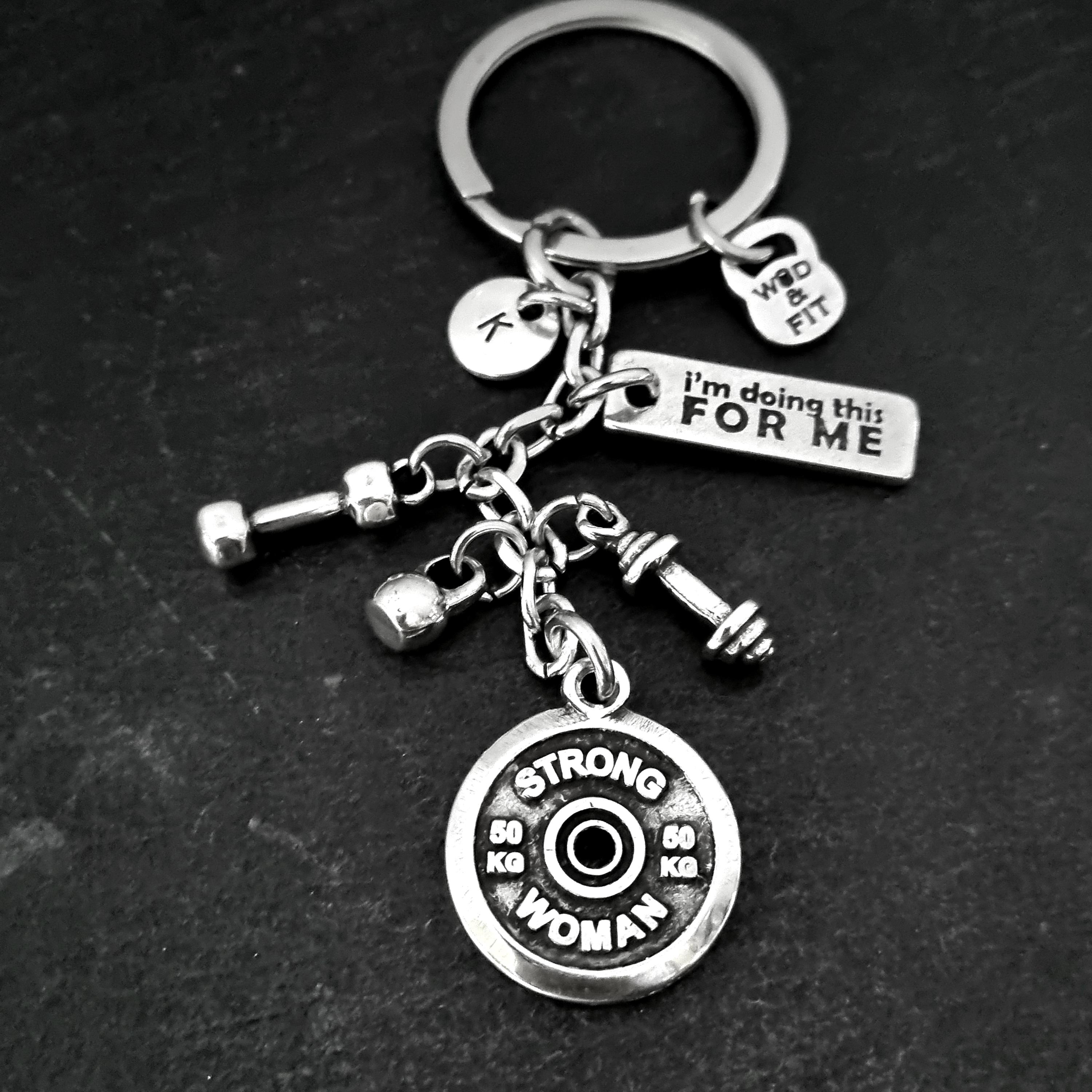⭐Gym Keychain With Weight Plate STRONG WOMAN, Dumbbell, Barbell, Kettlebell your Motivational Word and initial letter.