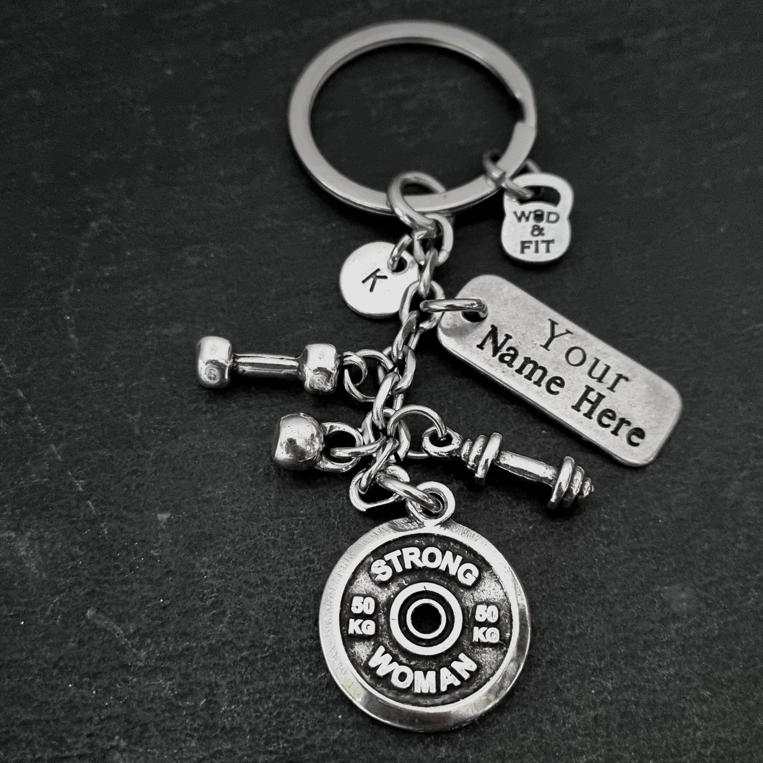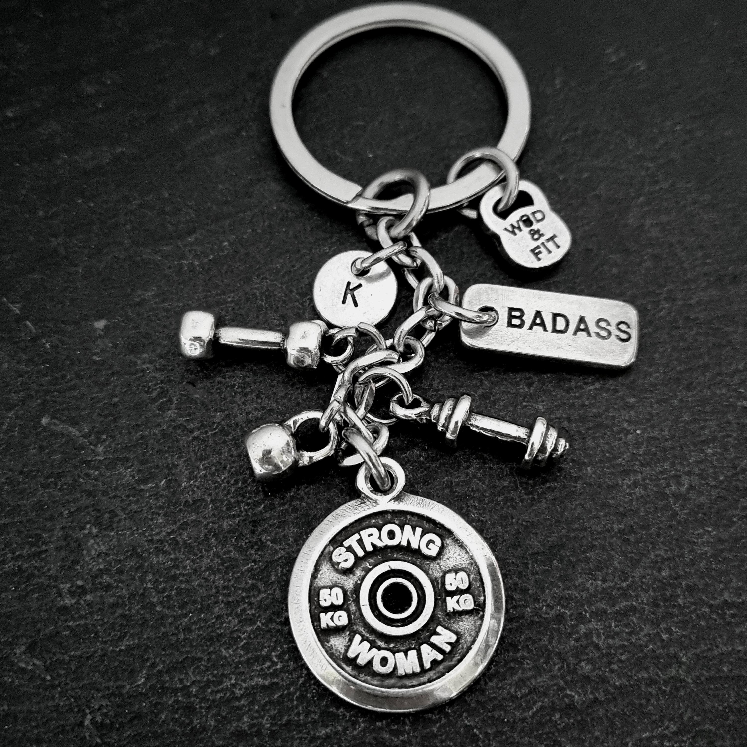 Gym Personalized Keychain STRONG WOMAN Workout Gift with Motivational Word, Dumbell Hex, Barbell, Kettlebell & Initial by Wod & Fit