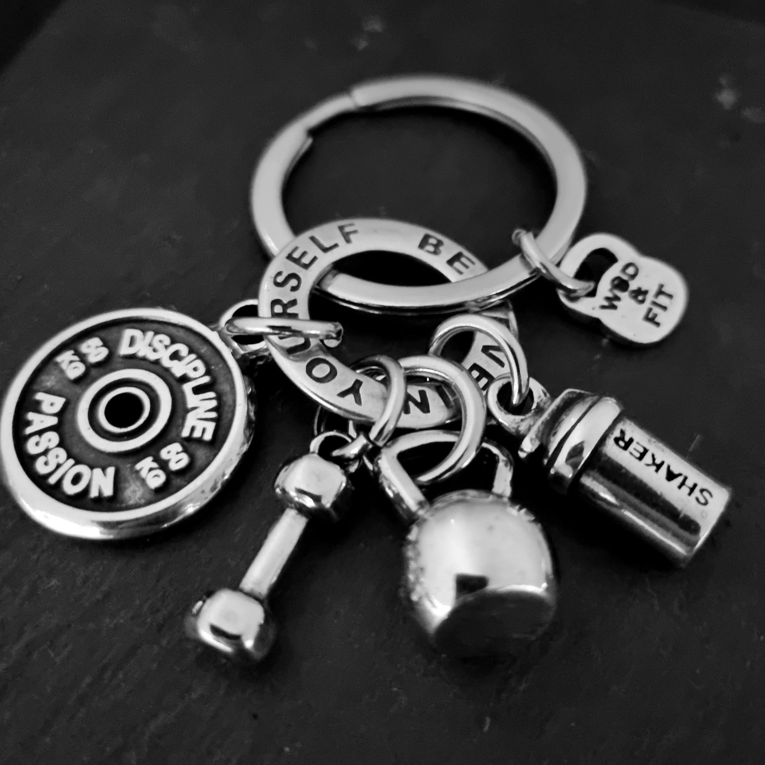 ⭐The key ring is composed of: Kettlebell, Shaker, Dumbbell Hex,FitPlate Motivational weight Plate with your favorite Motivational Word & the Motivatioanl Ring.