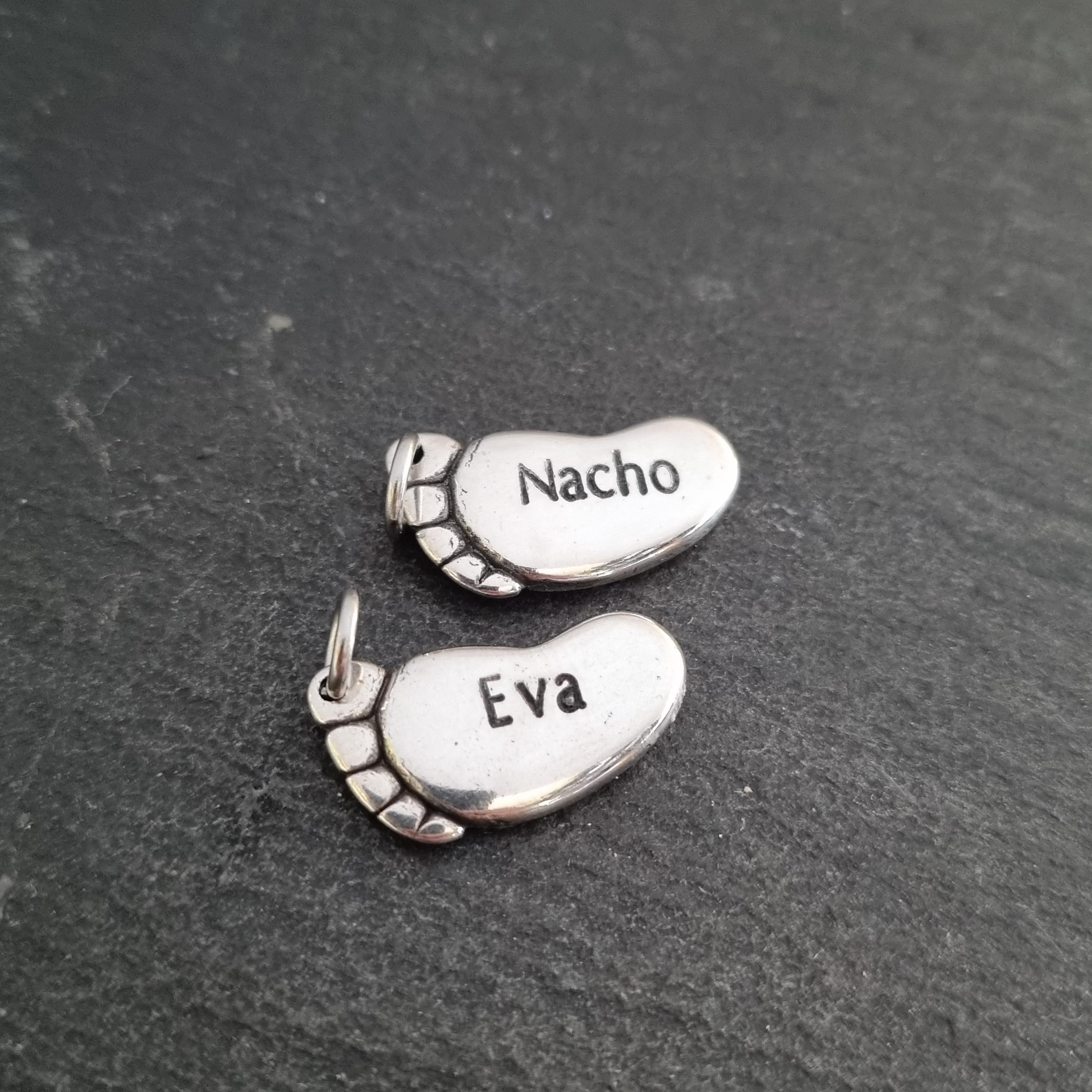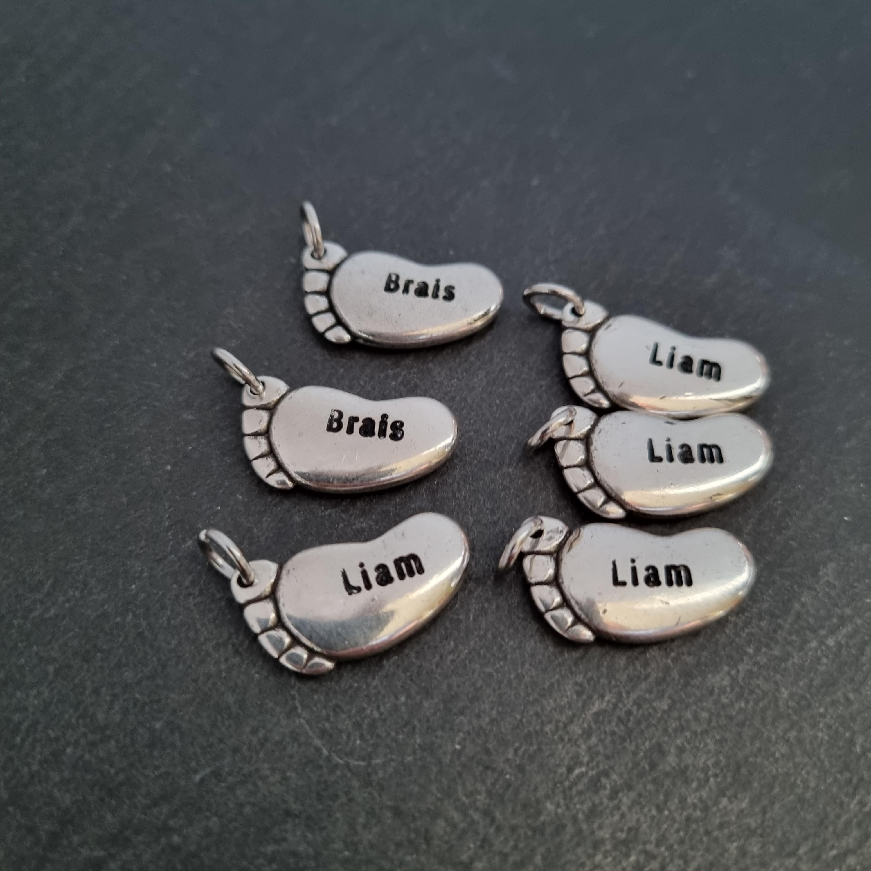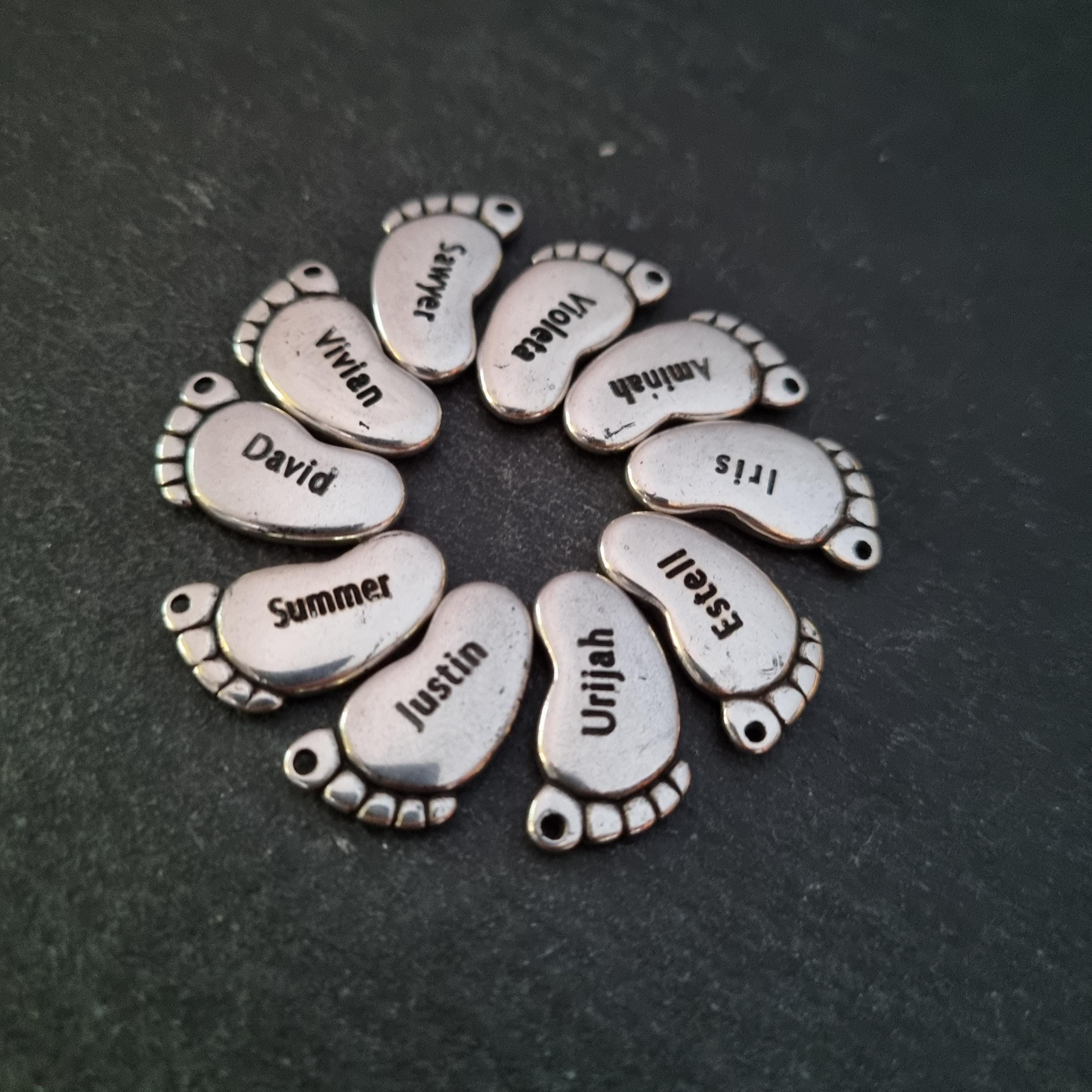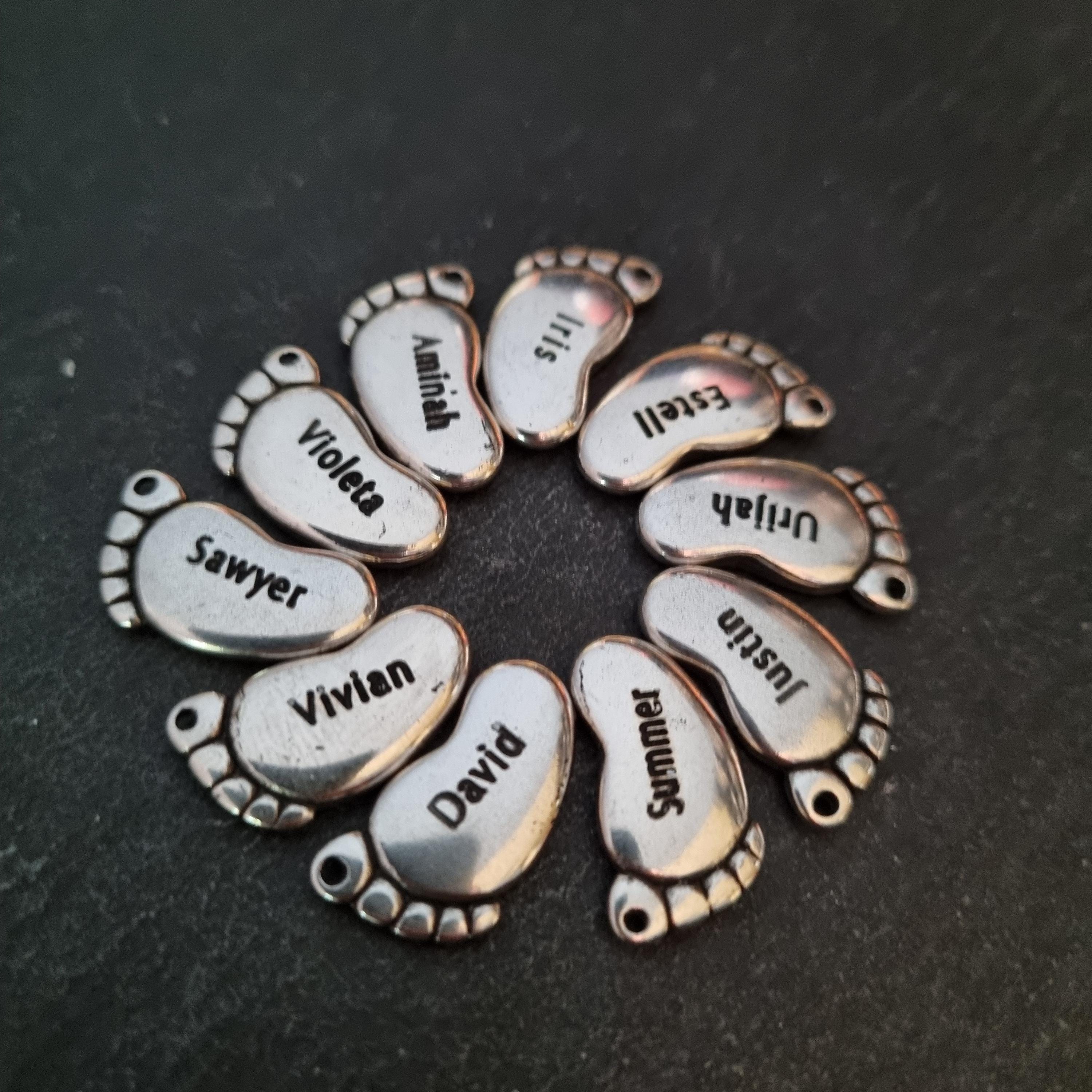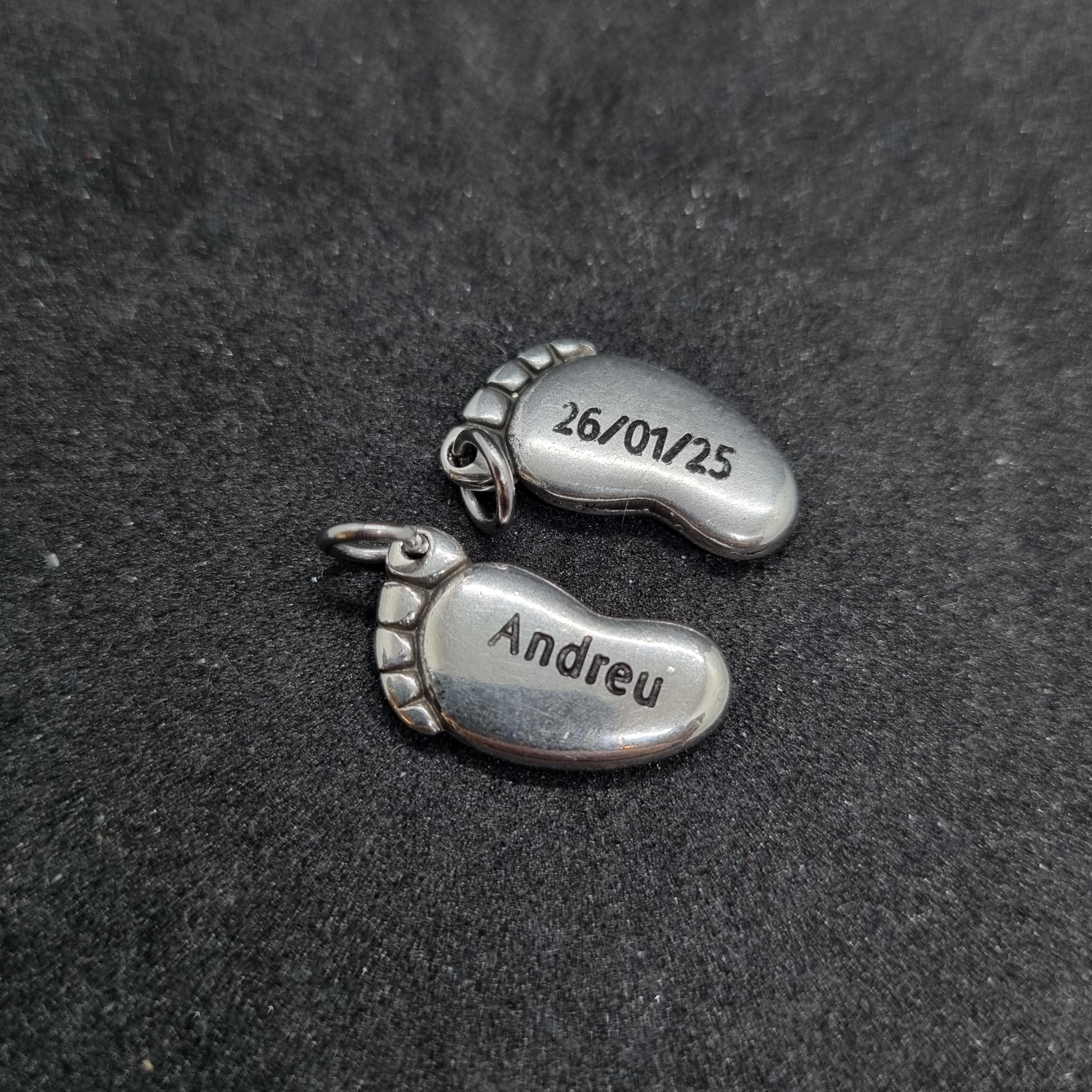 On the Foot You can write, Name, Date, a small phrase, idela for bracelets, pendant, for key chains everything is engraved, NO LASER